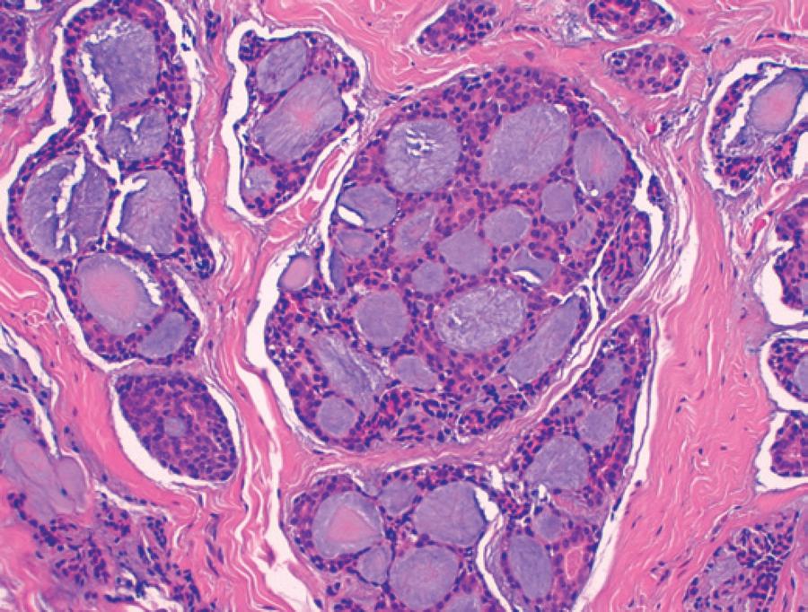 From a histological standpoint, there are three types of ACC: cribriform, tubular, and solid. Cribriform pattern foci are generally constant even when a different histological tumor type predominates. The cribriform pattern is the most common and associated with the best prognosis, whereas the solid type is less frequent but has a poorer prognosis(3,7,8).