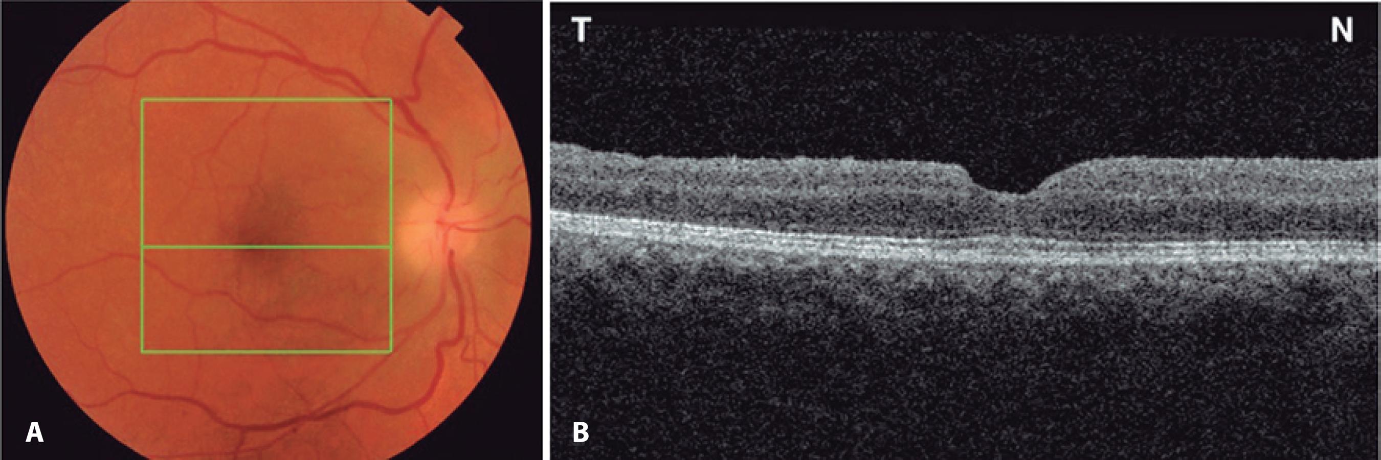 Figure 1 A) Preoperative fundus retinography demonstrating normal optic nerves with a small cup-to-disc ratio and macular hole affecting the right eye. The green square represents the area of the macular hole (6 × 6 mm) on optical coherence tomography (OCT). The central green horizontal line represents the OCT scan through the center of the fovea. B) OCT (horizontal scan) of the same eye demonstrating a full-thickness macular hole with overlying operculum.