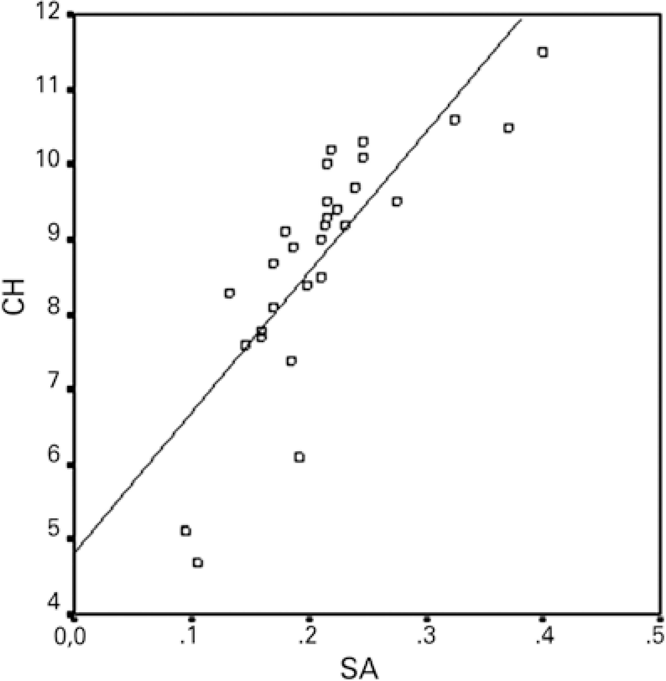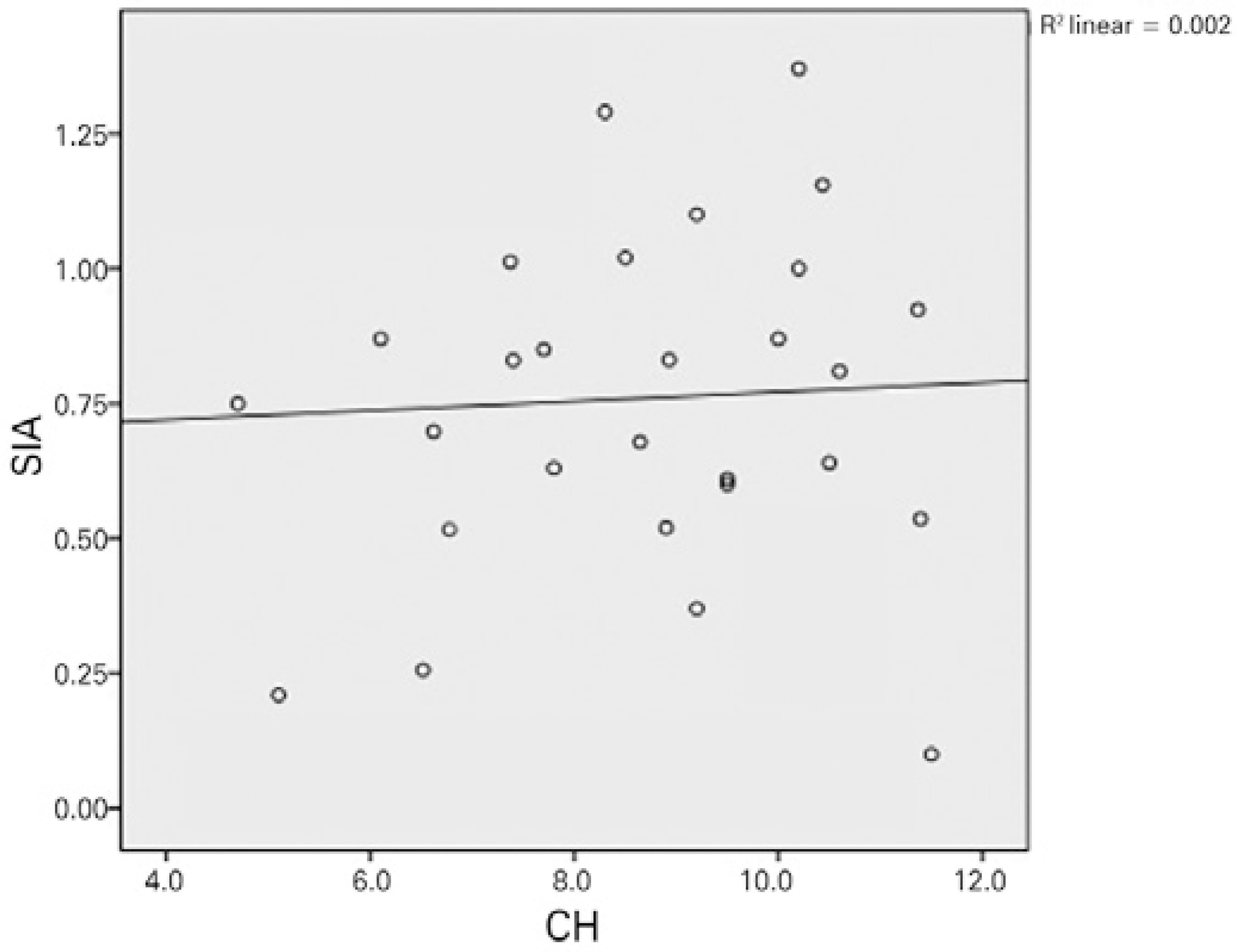 Except for a positive correlation between the 3-month postoperative CH and SA, no relationships were observed between the preoperative and 1- and 3-month postoperative values of CH/CRF, total RMS, HORMS, astigmatism, coma, trefoil, SA, and SIA. Figures 1 and 2 demonstrate the relationship between CH/CRF and SIA, and figure 3 presents the relationship between CH and SA at 3-months postoperatively.