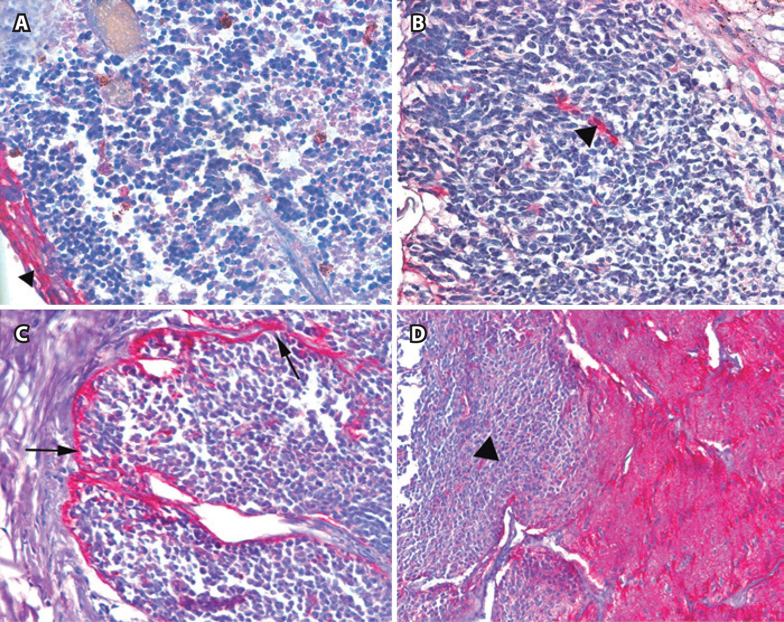 The thirty-nine archived tissue samples were obtained from patients between 4 and 108 months of age (mean ± SD, 24 ± 21.8 months; 48% female), with most cases in the range of 4 to 12 months. The series included 18 cases of well/moderately differentiated retinoblastoma (46.2%) and 21 cases of poorly differentiated retinoblastoma (53.8%). The level of choroidal/scleral invasion was stage I in 12 cases (30.7%), stage II in 7 (18%), stage III in 13 (33.3%), stage IV in 5 (12.8%), and stage V in 2 cases (5.2%). The degree of optic nerve invasion was stage I in 9 cases (23%), stage II in 15 (38.5%), stage III in 11 (28.2%), and stage IV in 4 cases (10.3%). Vitreous seeding was observed in 28 cases (71.8%) and invasion of retinoblastoma tumor cells into the anterior chamber was observed in 8 cases (20.5%). Basophilia of vascular walls, inner limiting membrane of the retina, and fibers of Zinn's zonule was observed in 18% of cases.