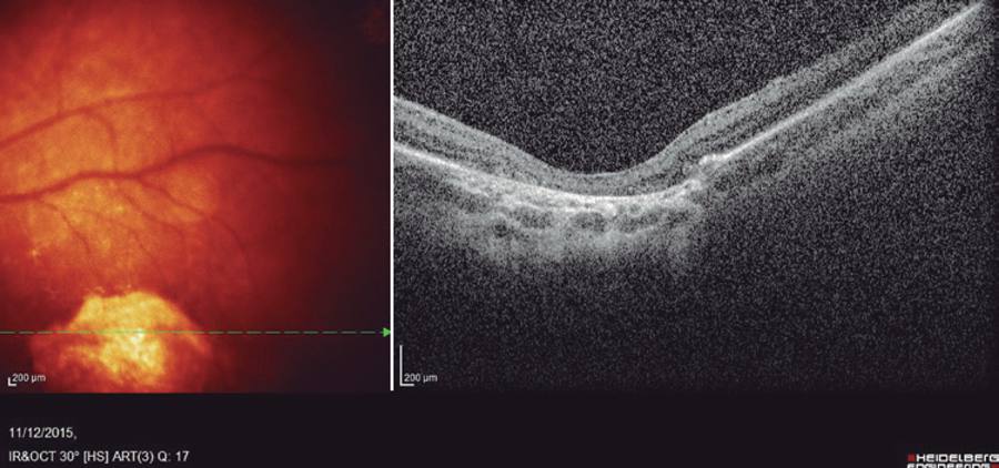 Figure 1 Spectral domain OCT of a macular lesion in an infant with presumed Zika virus-associated microcephaly, demonstrating retinal thinning with atrophy of the outer retina, including the outer nuclear layer and ellipsoid zone, associated with retinal pigment epithelium hyper-reflectivity and increased penetration of OCT into deeper layers of the choroid and sclera.