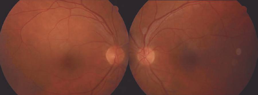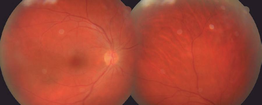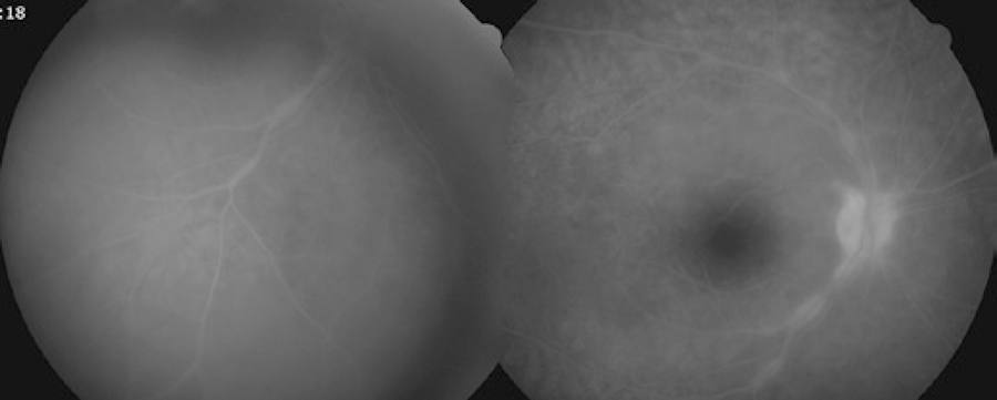 Figure 1 Color fundus photography showing mid-peripheral vascular sheathing. Images appear blurred because of intensive vitritis.