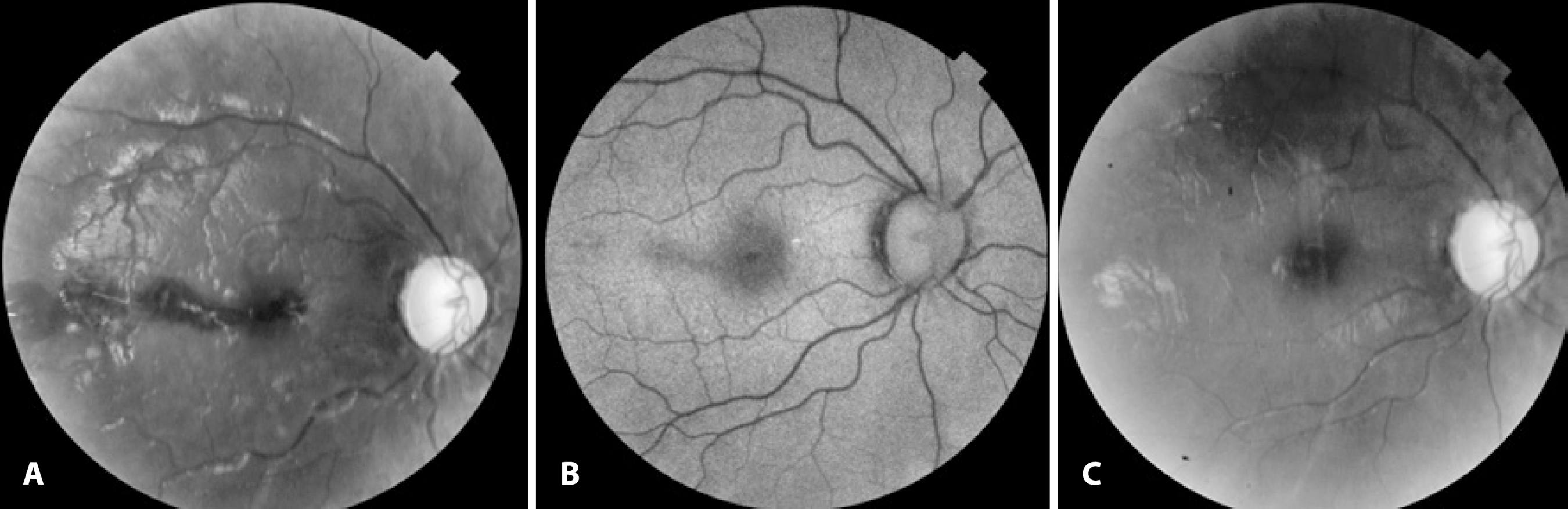 Figure 1 A) Grey-scale fundus image of the right eye showing foveal and extrafoveal retinal hemorrhage 5 days after the roller coaster ride. B) Decreased autofluorescence in the areas where retinal hemorrhage was noted. C) Grey-scale fundus image of the right eye 2 months after admission, showing resolution of the hemorrhages.