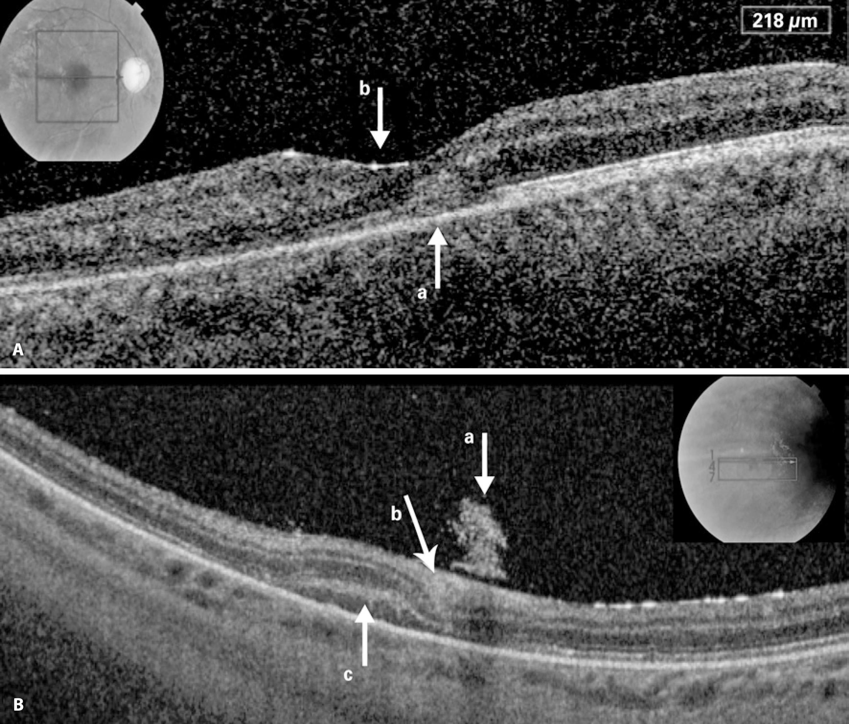 Figure 2 A) Spectral-domain optical coherence tomography (SD-OCT) image of the fovea revealing intra- and subretinal hemorrhage blurring the continuity of the IS/OS band (lower arrow), with increased hyper-reflectivity of the internal limiting membrane (ILM) (upper arrow). B) SD-OCT image of the extrafoveal area, showing hyper-reflectivity in the vitreous because of an hemorrhage (upper arrow), hyper reflectivity under ILM and in the ganglion cell layer (middle arrow) because of an hemorrhage, and hyper-reflectivity corresponding to the subretinal hemorrhage (lower arrow).