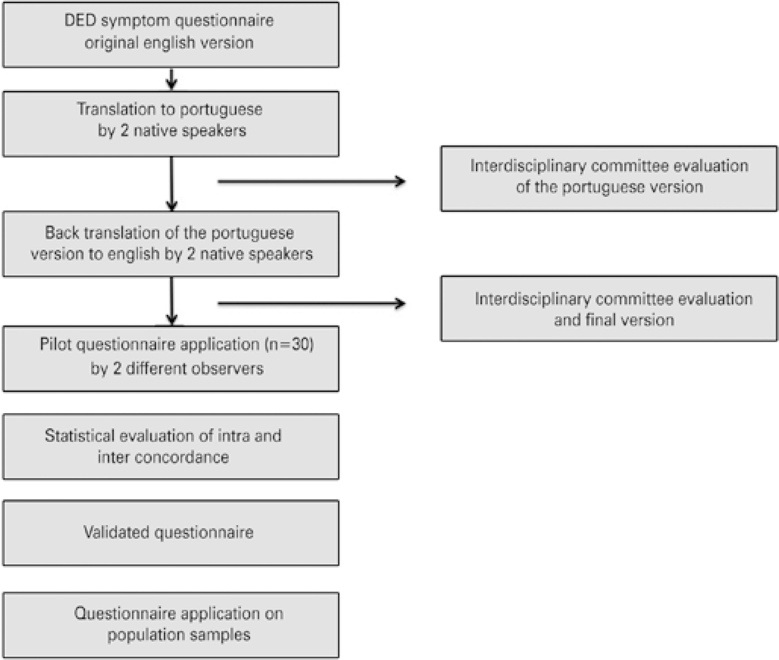 Despite the frequent incidence of DED, its prevalence in the Brazilian population is poorly understood. The present study indicates that the Portuguese translation and adaptation of this DED symptom questionnaire yielded a reliable tool, as evidenced by the high internal consistency of the answers obtained and the high correlation coefficients. To develop this tool, we followed guidelines used previously in similar endeavors, including a scientifically rigorous translation and adaptation process. Although the chosen questionnaire comprised simple and direct questions, the use of two independent translators for each language translation was very useful because it allowed the multidisciplinary assessment panel to validate the questionnaire through comparisons and discussion. The inclusion of members with distinct areas of expertise in this assessment panel was crucial as it allowed comparisons from different points of view and solved discrepancies with the aims of consensus and proper adaptation. Accordingly, our results demonstrate that this validated questionnaire is both reliable and reproducible and can be applied in future population-based studies to determine the prevalence of DED symptoms.