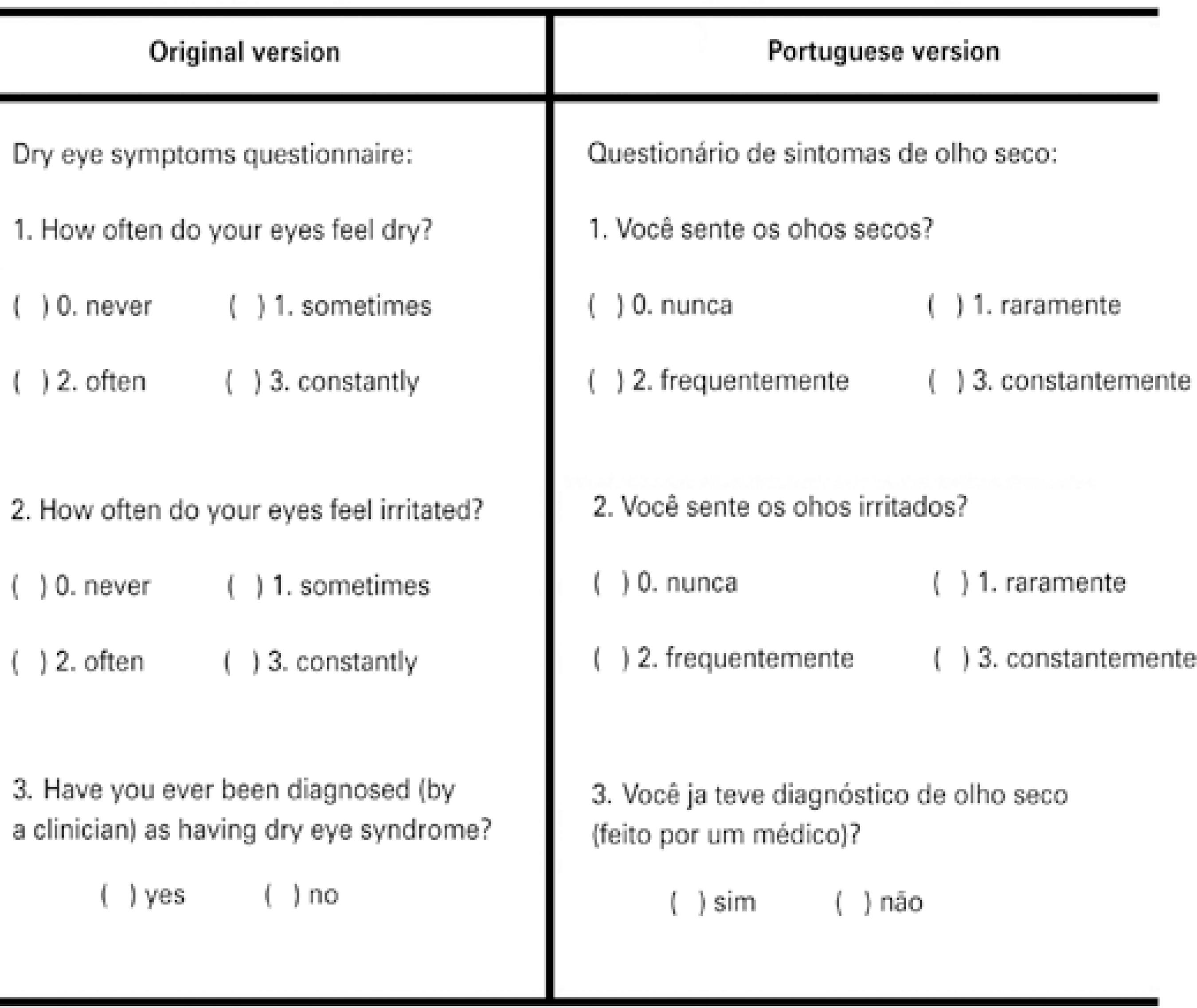 An interdisciplinary committee, comprising two ophthalmologists (a general ophthalmologist and dry eye specialist), two residents, and one medical student, evaluated both the English and Portuguese language versions to ensure an adequate translation and transcultural adaptation without altering the applicability of the questionnaire.