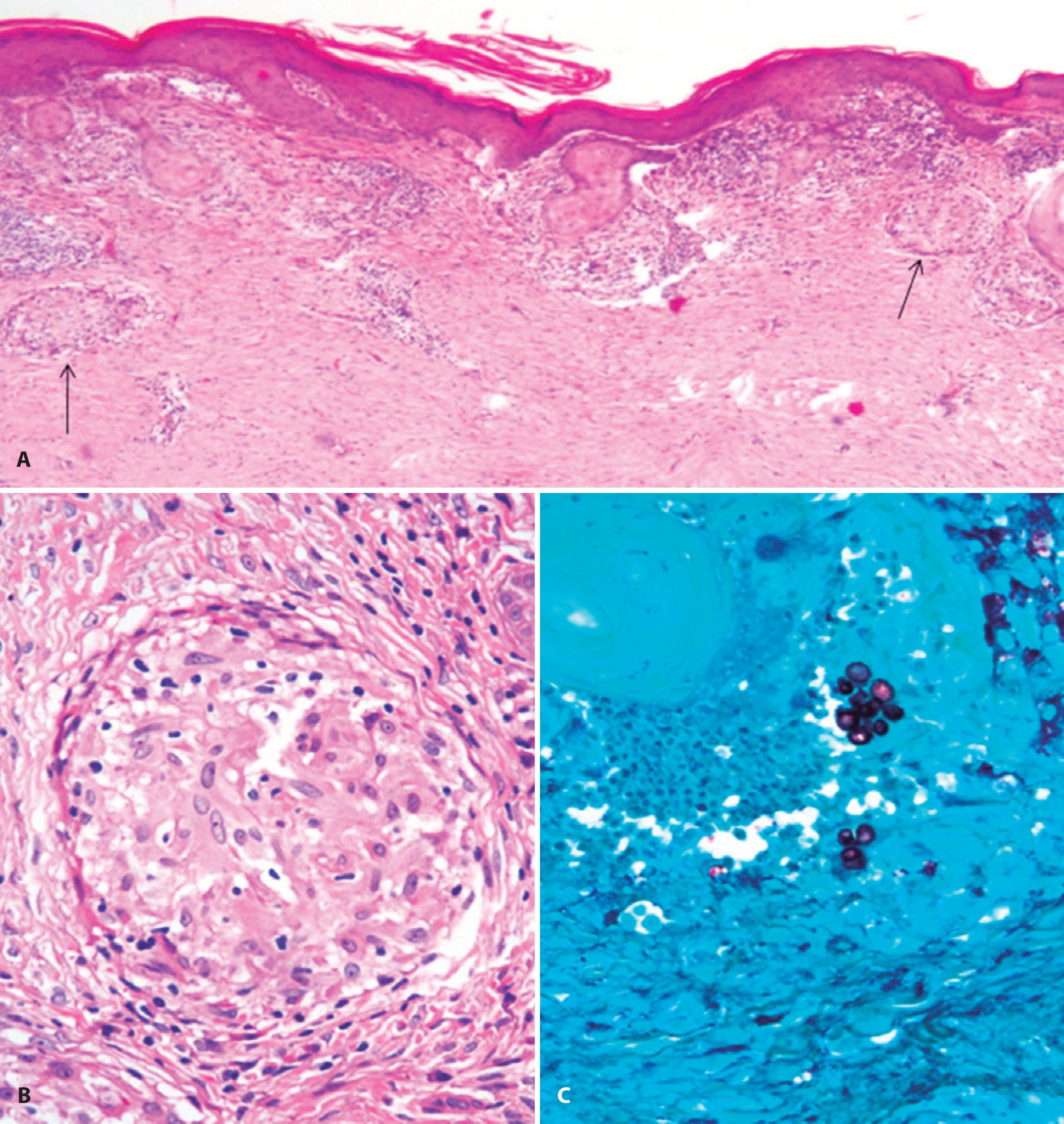 Figure 1 Anatomo-pathological biopsy performed in the face in the right temporal region of the patient. A) Skin, magnification at 4×; stained with hematoxylin and eosin (HE). Skin showing mild acanthosis, orthokeratosis, and a focus of parakeratosis, with mild perivascular lymphoplasmocytic inflammatory infiltration of the interstitial spaces, both superficial and deep, with well-formed granuloma. B) Detail of well-formed granuloma formed by epithelioid cells stained with HE and shown at 40× magnification. C) Special staining with Grocott's silver showing the presence of structures called chromoblastomycetes.