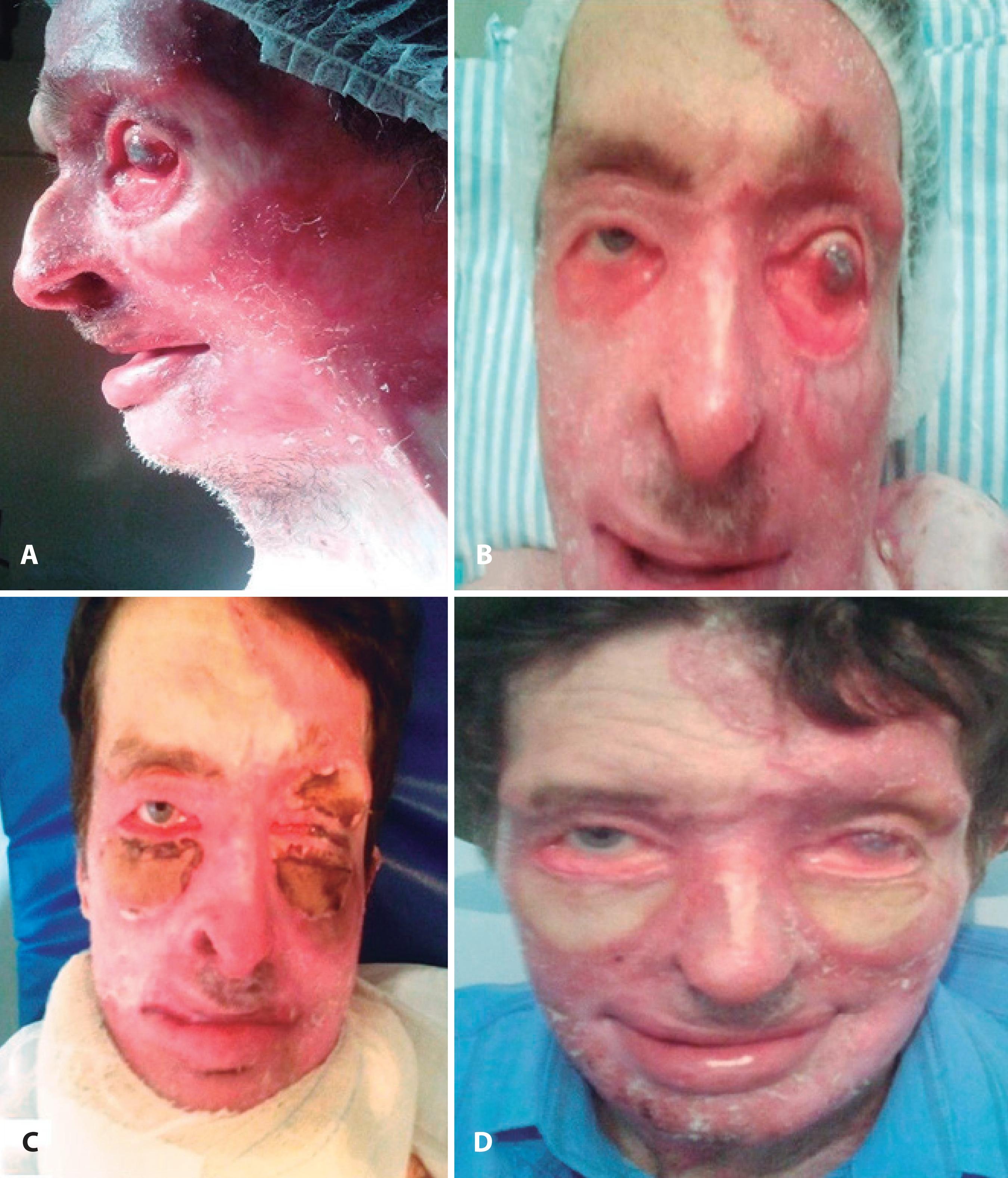When admitted to the ophthalmology service, the patient's lesion had spread to his face and periorbital zone (Figure 2A). The severe cicatricial ectropion was treated with a skin graft combined with a tarsal strip procedure on the lower eyelids of both eyes; the cicatricial retraction in the upper eyelid of the left eye was also treated with a skin graft. The skin grafts were fixed with tie-over sutures, which were removed after 5 days. The surgical treatment performed by the oculoplastic department of the hospital was performed to reduce corneal exposure and eye dryness, which had caused significant visual loss in the left eye as well as a risk of eye perforation (Visual acuity: right eye, 20/25; left eye, hand motion).