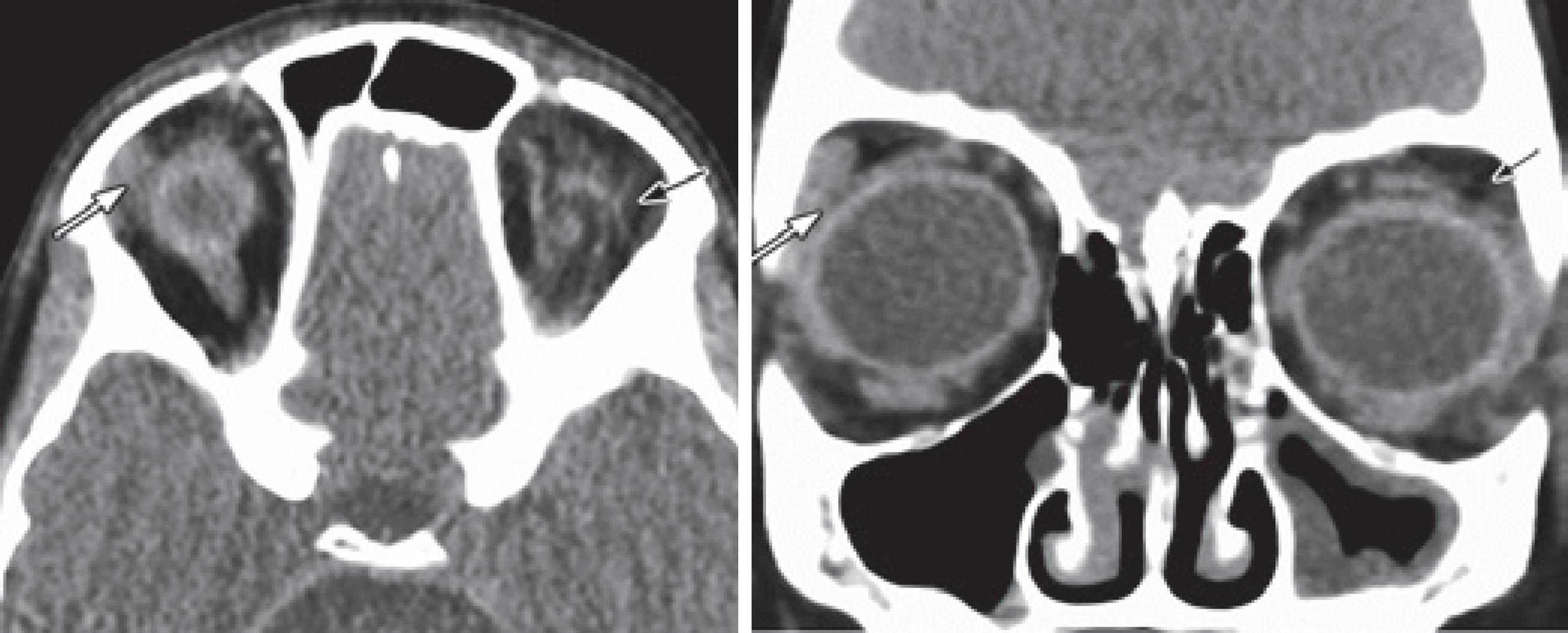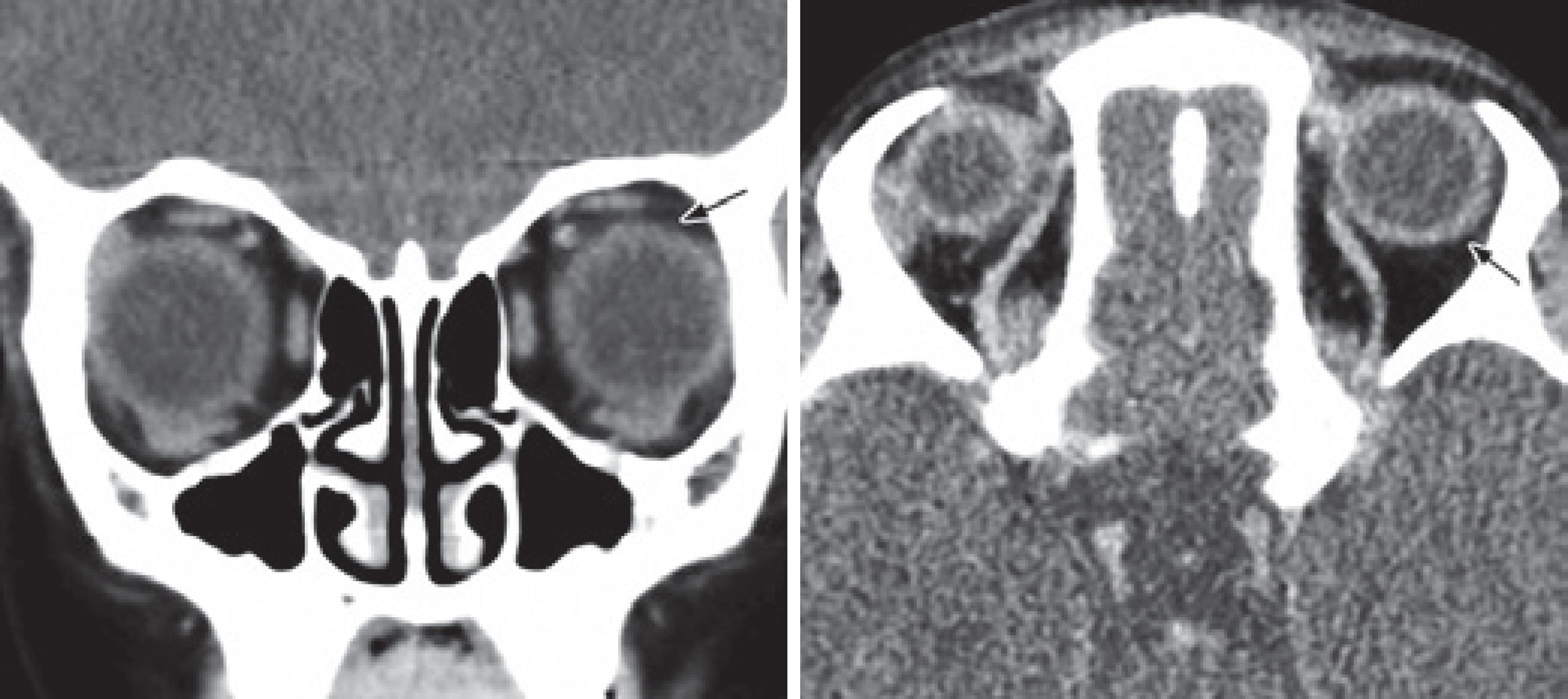 A seven years and eight month old male with congenital upper lid ptosis of the left eye had undergone levator resection two years before revision of overcorrection and lower punctal occlusion. On examination his visual acuity was 20/20 in the right eye and 20/40 in the left eye. MRD1 was 4 mm the right eye and 1 mm in left eye. LPS function was 6 mm in the left eye. Biomicroscopy showed diffuse punctate keratopathy in the left eye despite a long-term non-resorbable plug (SmartPlug; Medennium Inc., Irvine, CA, USA) inserted on the lower lacrimal punctum. Computed tomography imaging indicated the absence of the left lacrimal gland (Figure 2). The parents were not satisfied with the cosmetic appearance of the child and requested revision of the ptosis surgery. During this third procedure, absence of the orbital lobe of the lacrimal gland was noted in association with scar tissue in the lacrimal fossa. The remnants of the levator were identified and re-advanced successfully. Dry eye was treated with frequent instillation of artificial tears and insertion of a punctal plug in the upper lid.