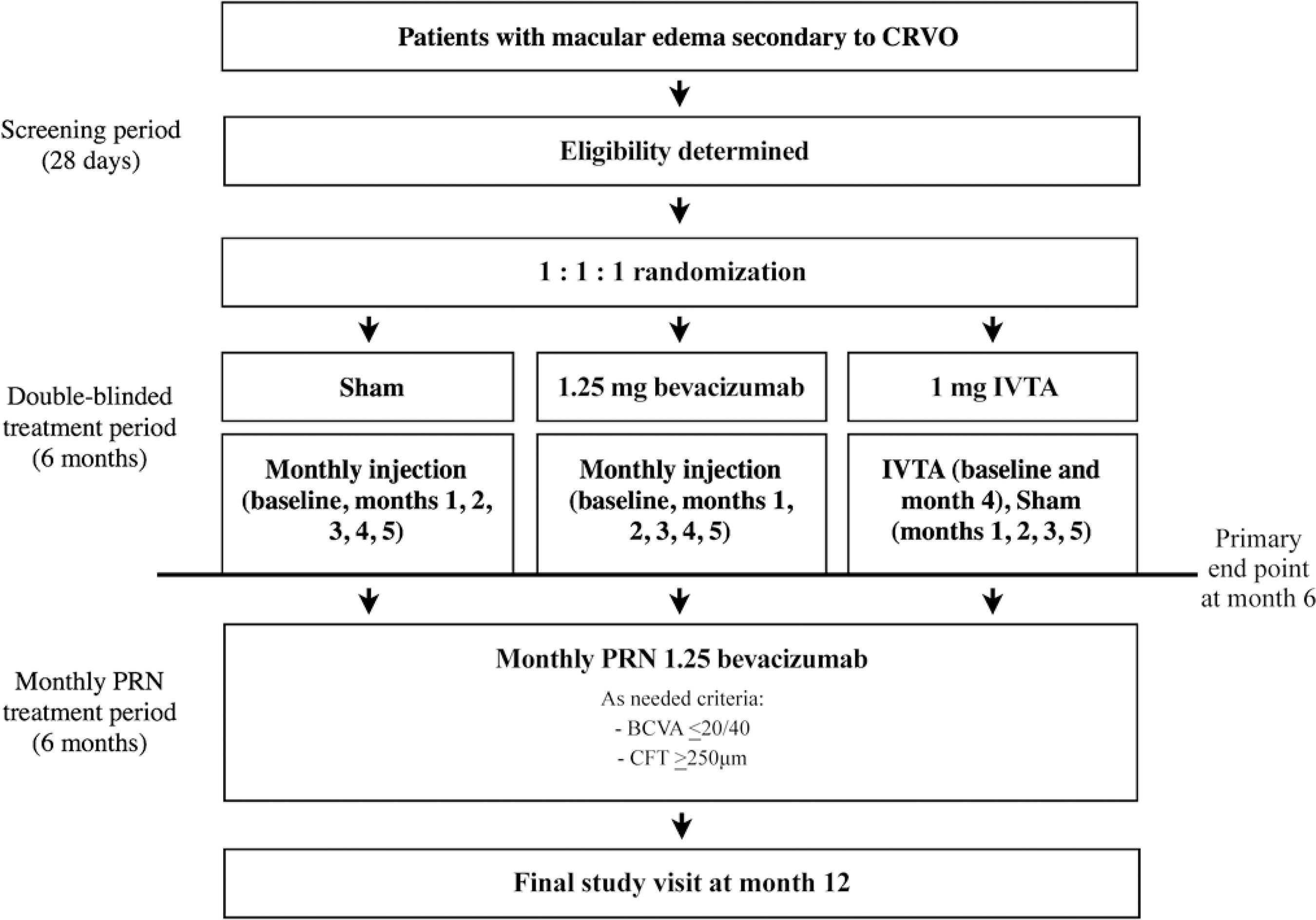 Figure 1. Study design. Eligible patients were randomized 1:1:1 to receive monthly sham, 1.25-mg intravitreal bevacizumab (IVB), or 1-mg intravitreal triamcinolone acetonide (IVTA) injections during the 6-month treatment period. During the monthly pro ra nata (PRN) treatment observation period, patients were eligible to receive monthly intraocular 1.25-mg IVB injections if they had a Snellen equivalent best-corrected visual acuity of 20/40 or worse according to the Snellen chart or central foveal thickness of 250 µm or more according based on spectral-domain optical coherence tomography.CRVO=central retinal vein occlusion.