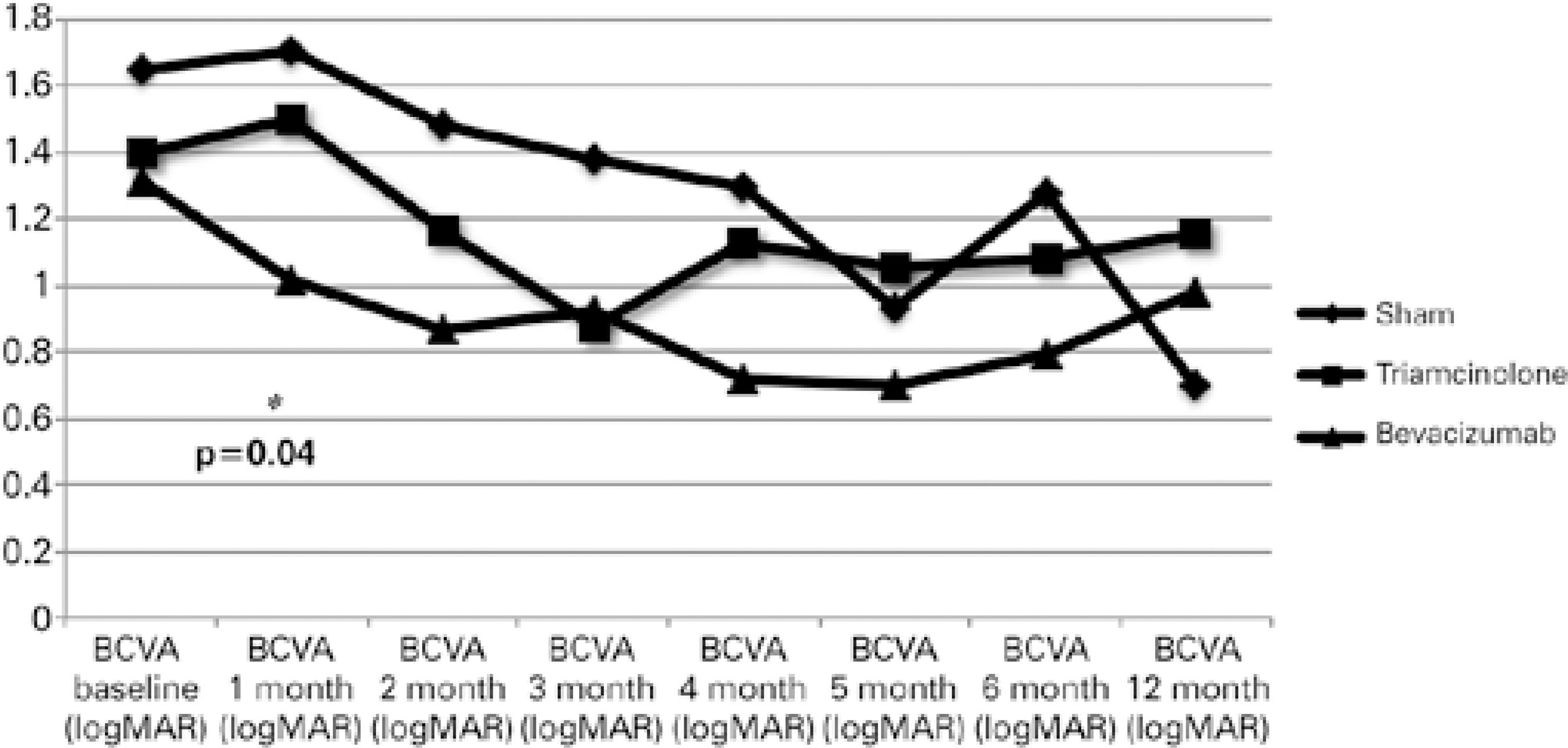 At months 6 and 12, the mean logMAR BCVA levels were 0.96 ± 0.67 (p=0.41) and 0.99 ± 0.53 (p=0.44), respectively. The mean change in BCVA during the first 12 months in the groups is shown in figure 2. BCVA differed significantly (p<0.05) among the groups only at month 1. Macular ischemia was observed in 13 eyes, including four (40%), five (45.45%), and four (28.57%) eyes randomized to sham, IVTA, and IVB treatment (p=0.84), respectively.