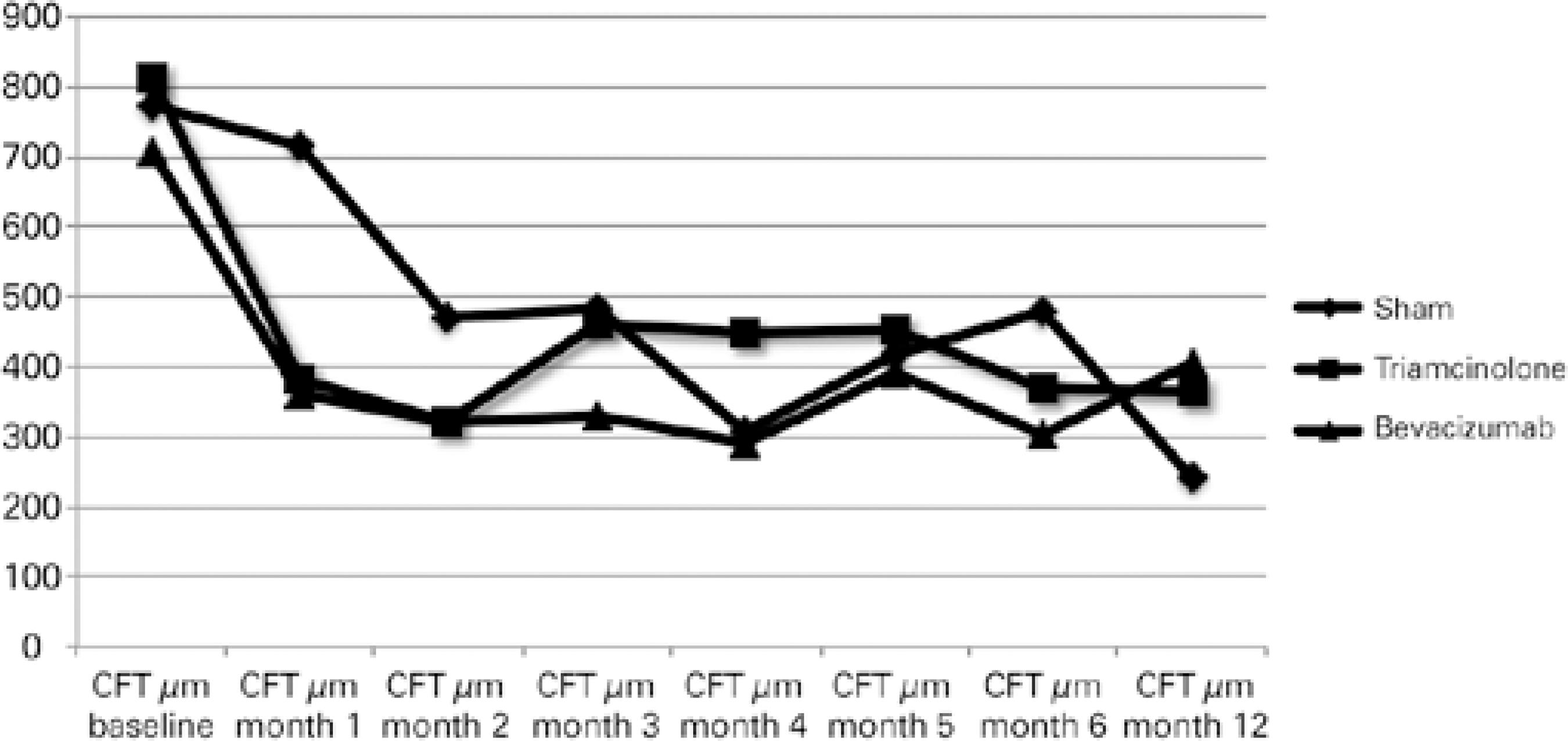 Figure 3 Mean change from the baseline central foveal thickness (CFT) over time to month 12. CFT did not differ significantly among the groups over the 12 months.