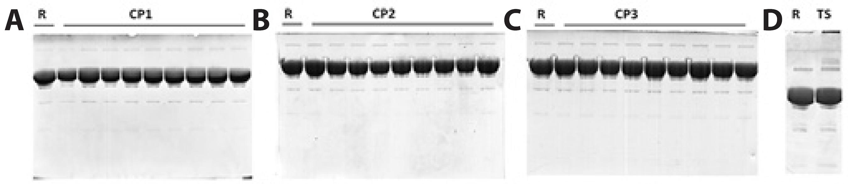 Figure 1 SDS-PAGE of bevacizumab repacked by CP1 (A), CP2 (B), and CP3 (C). Reference bevacizumab was run in each gel for comparison. Thermally stressed samples showed two extra bands of higher molecular weight that were not observed in the reference or repacked bevacizumab (D). R= reference bevacizumab; CP= compounding pharmacy; TS= thermally stressed bevacizumab.