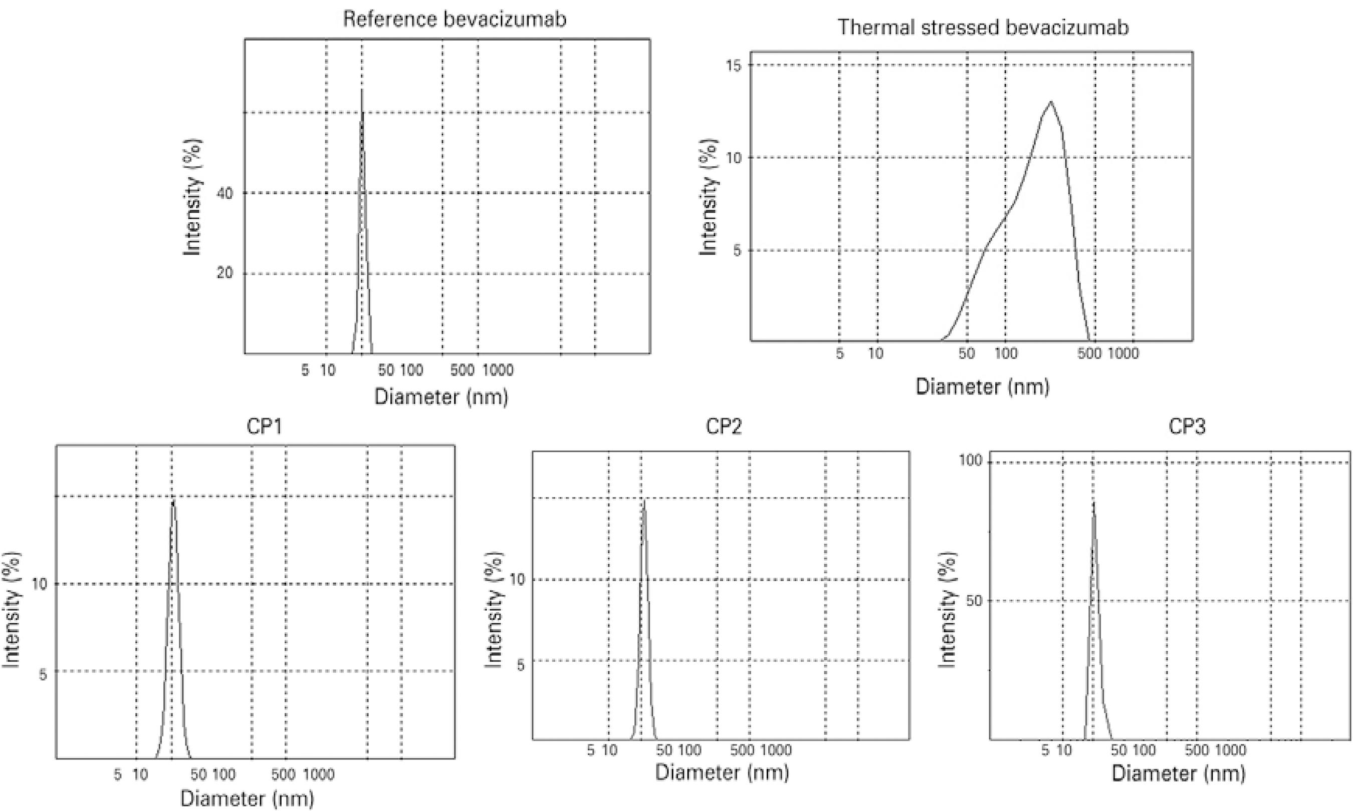 DLS was performed to investigate changes in the mean hydrodynamic diameter of proteins in the bevacizumab samples as a result of nano-sized aggregates(29). The results showed no evidence of small-sized aggregates in the reference or repacked samples; both showed a single peak by DLS and equivalent mean hydrodynamic diameters. The thermally stressed bevacizumab results showed peak shifts indicative of larger sizes and higher average hydrodynamic diameter, which was indicative of protein aggregation.