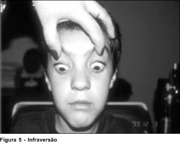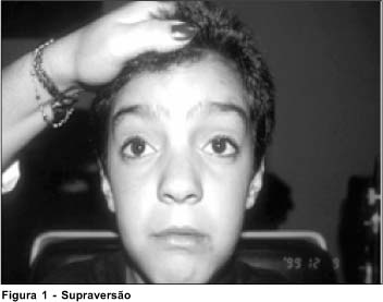 Ao exame oftalmológico em uso da medicação, o paciente apresentava-se com paralelismo ocular em posição primária da mirada, motilidade ocular intrínseca preservada, ausência de adução, abdução e elevação em ambos os olhos, redução na infraversão e ptose palpebral bilateral leve (Figura). Apresentava acuidade visual sem correção de 20/25 em ambos os olho. Biomicroscopia e fundoscopia normais. Ao exame de estereopsia realizado através do teste de Titmus apresentava 50 segundos de arco. A única função muscular externa encontrada foi a dos músculos retos inferiores e mesmo assim com redução da função de aproximadamente -2 (Figura).