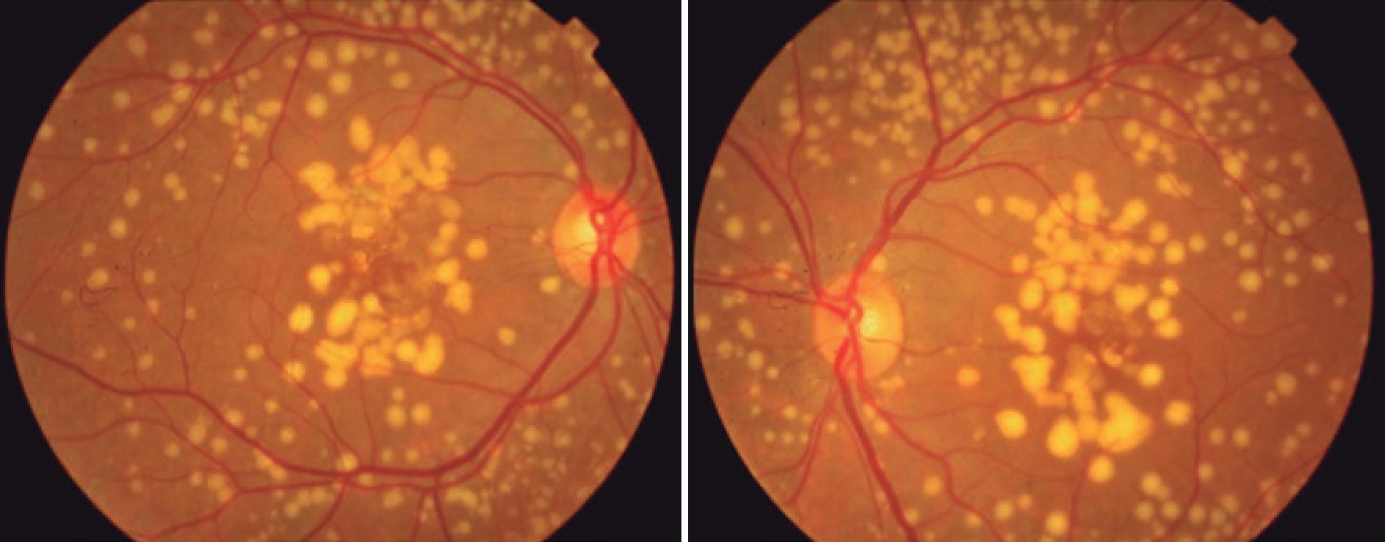 Figure 1 A fundus photograph showing large, bilateral, yellowish lesions in the macular area and retinal periphery.