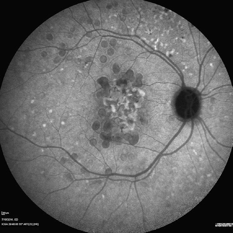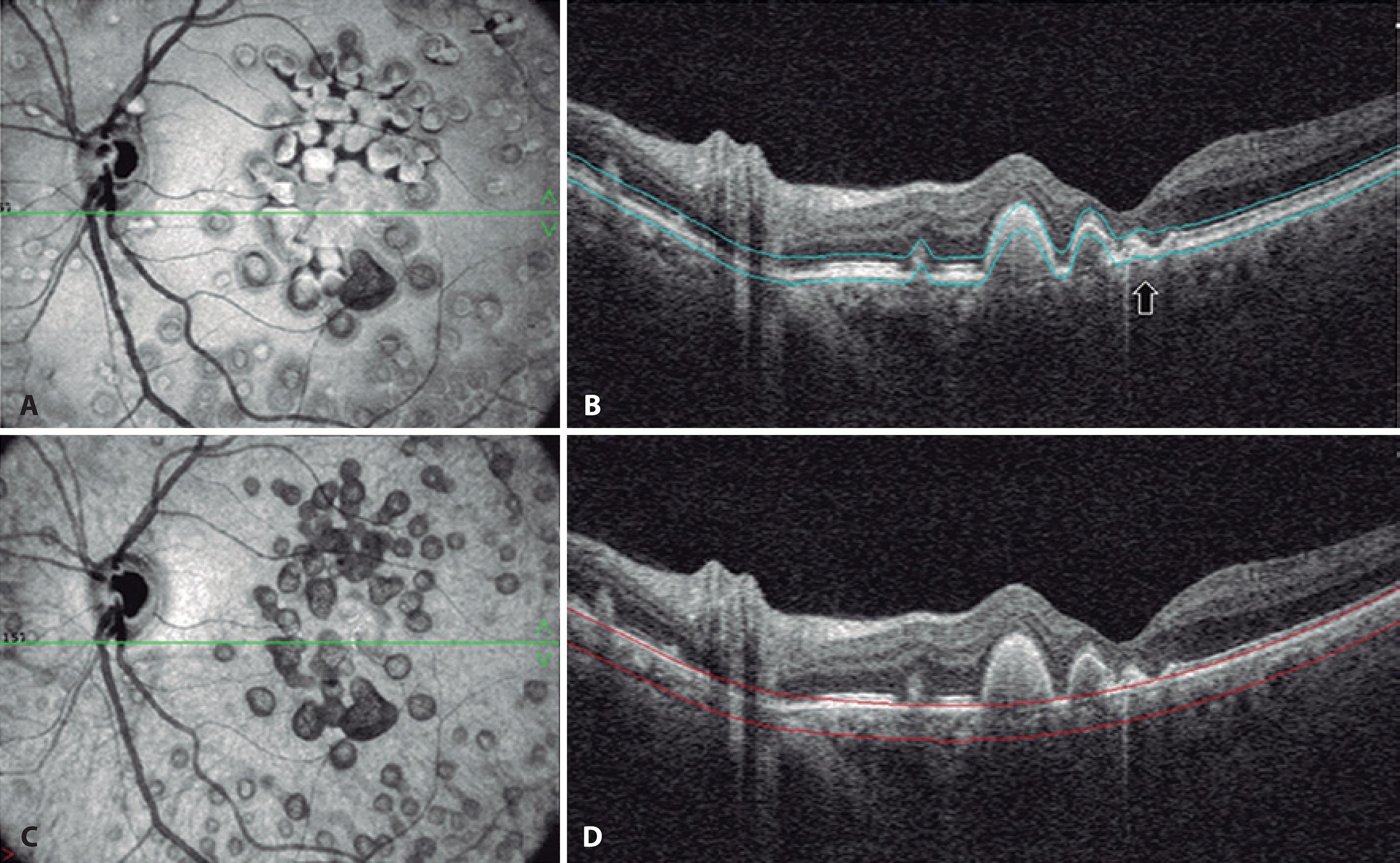 The structural en face OCT images showed a hyper-reflective center surrounded by a hypo-reflective halo bordered by two rings, one of which was hyper-reflective and the other hypo-reflective, similar to the donut effect seen on the ICGA images (Figure 2). OCT is noninvasive and can help differentiate LCD from other early-onset drusen, such as Malattia Leventinese and cuticular drusen. In OCT images, LCD have been described as having a sawtooth pattern, with the height of each LCD approximately equal to its basal diameter. The neurosensory retina appears to be spared in the area overlaying the drusen, although the overlaying RPE is much thinner at the apex of each druse than between the drusen. In Malattia Leventinese, confluent sub-RPE accumulation on OCT has been reported. The smaller drusen of this condition have a radial distribution and a confluence of large drusen with sub-retinal fibrous plaque occurs. The typically pale drusen are adjacent to the optic disc(3). Furthermore, OCT allows observation of focal loss of cellular visibility, which has a mosaic pattern in patients presenting with drusen(6,7). The smallest LCD do not affect the ellipsoid zone(5). This imaging approach might serve as the foundation for valuable imaging-based biomarkers for detecting the earliest disease stages, tracking progression, and monitoring treatment response(9).