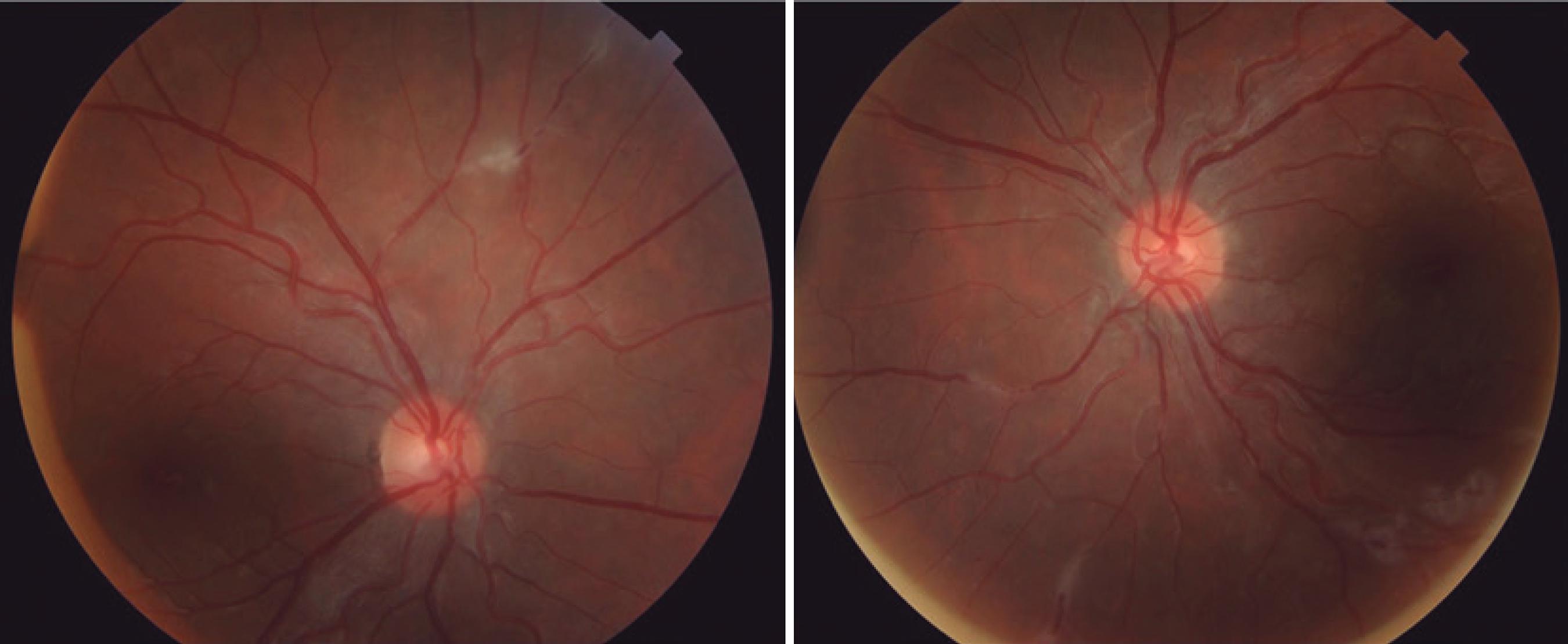 Figure 1 Retinography showing areas of venous vascular sheathing and candle wax drippings sign in both eyes. OD in the right and OS in the left.