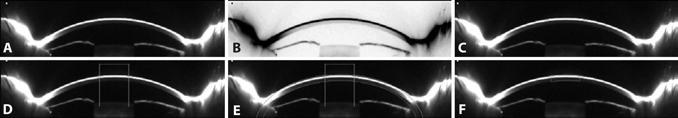 To determine a 3-mm central region, a central line 3-mm long was drawn and delimited with two vertical lines (Figure 1 D). This region of interest was replicated in each eye. To select the width of the area to be analyzed, and to avoid as far as possible the inclusion of the tear film in the corneal backscatter measurements, we established as a reference point the limit between the corneal endothelium and the aqueous humor, making this reference line coincide with an ellipse that was drawn to delimit the second surface of the cornea, and a band with the CCT value to delimit the first surface of the cornea (Figure 1 E). Finally, the 3-mm central region was outlined (Figure 1 F). The same procedure was performed for the central 5-mm region.