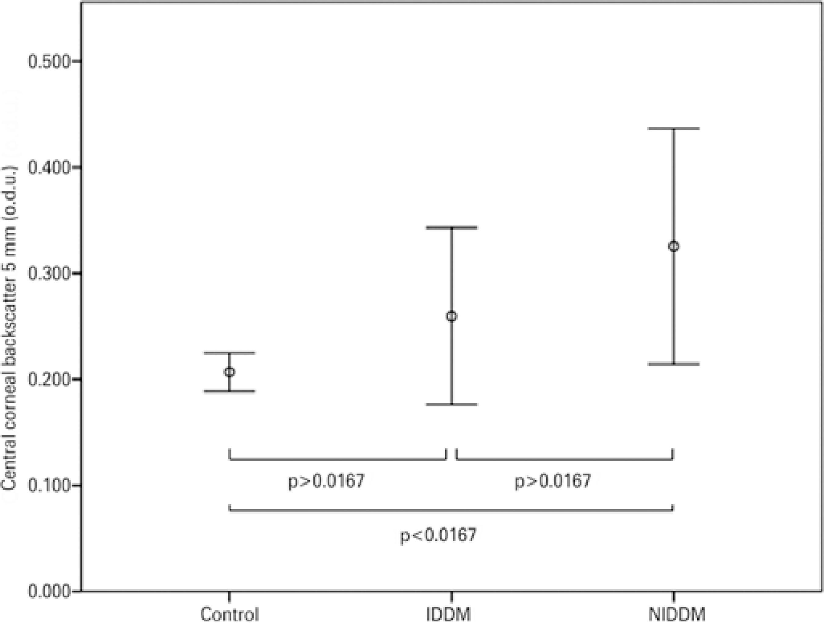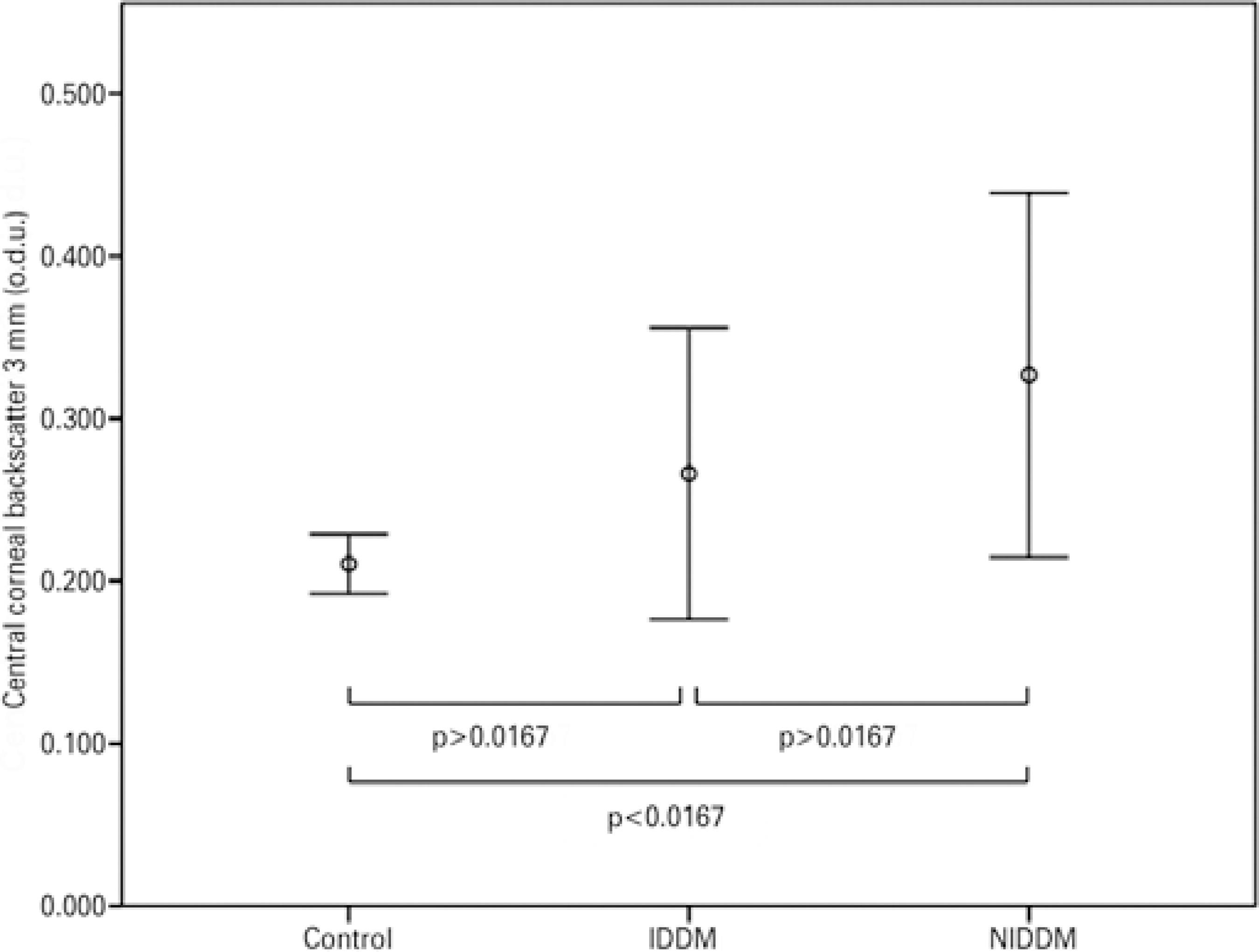 Differences in central corneal backscatter among the IDDM patients, NIDDM patients, and healthy controls, and among the stages of DR, were assessed with the Kruskal-Wallis test. To determine which pairwise comparisons were responsible for the overall difference between groups, separate Mann-Whitney U tests were performed on each pair (3 tests), assessing significance as p<0.0167 (i.e., 0.05/3).