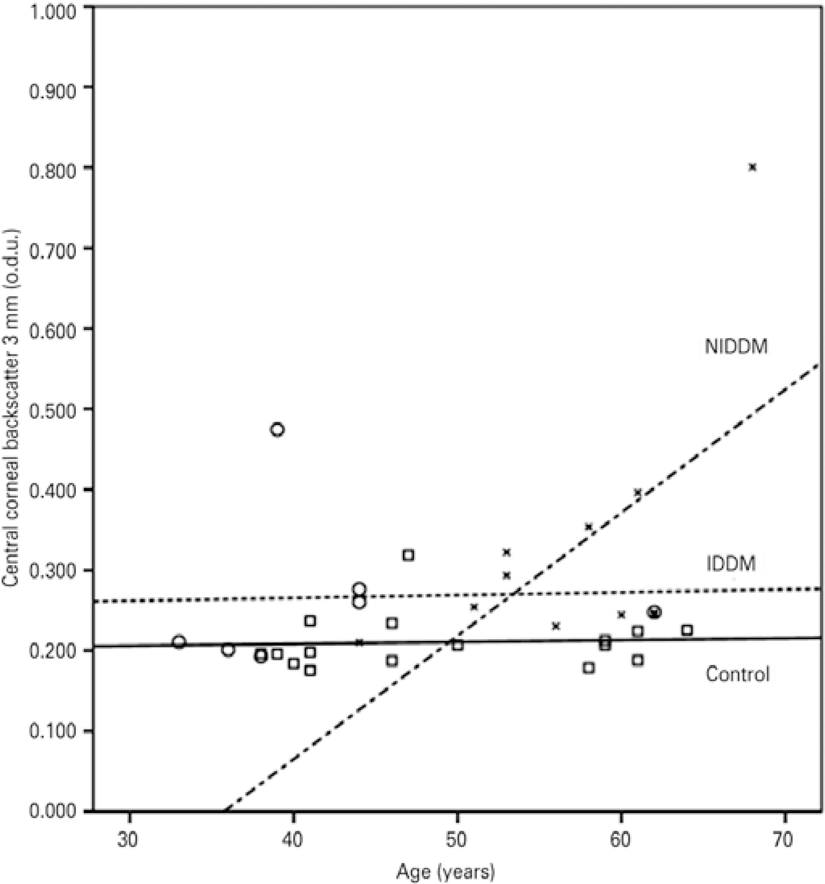 Figure 4 Correlations between corneal backscatter for the central 3 mm and age in the control subjects (squares and solid line; r=0.062; p>0.05), the patients with insu lin-dependent diabetes mellitus (IDDM) (circles and dotted line; r=0.523; p>0.05), and the patients with non-insulin-dependent diabetes mellitus (NIDDM) (blades and dotted/dashed line; r=0.604; p<0.05).