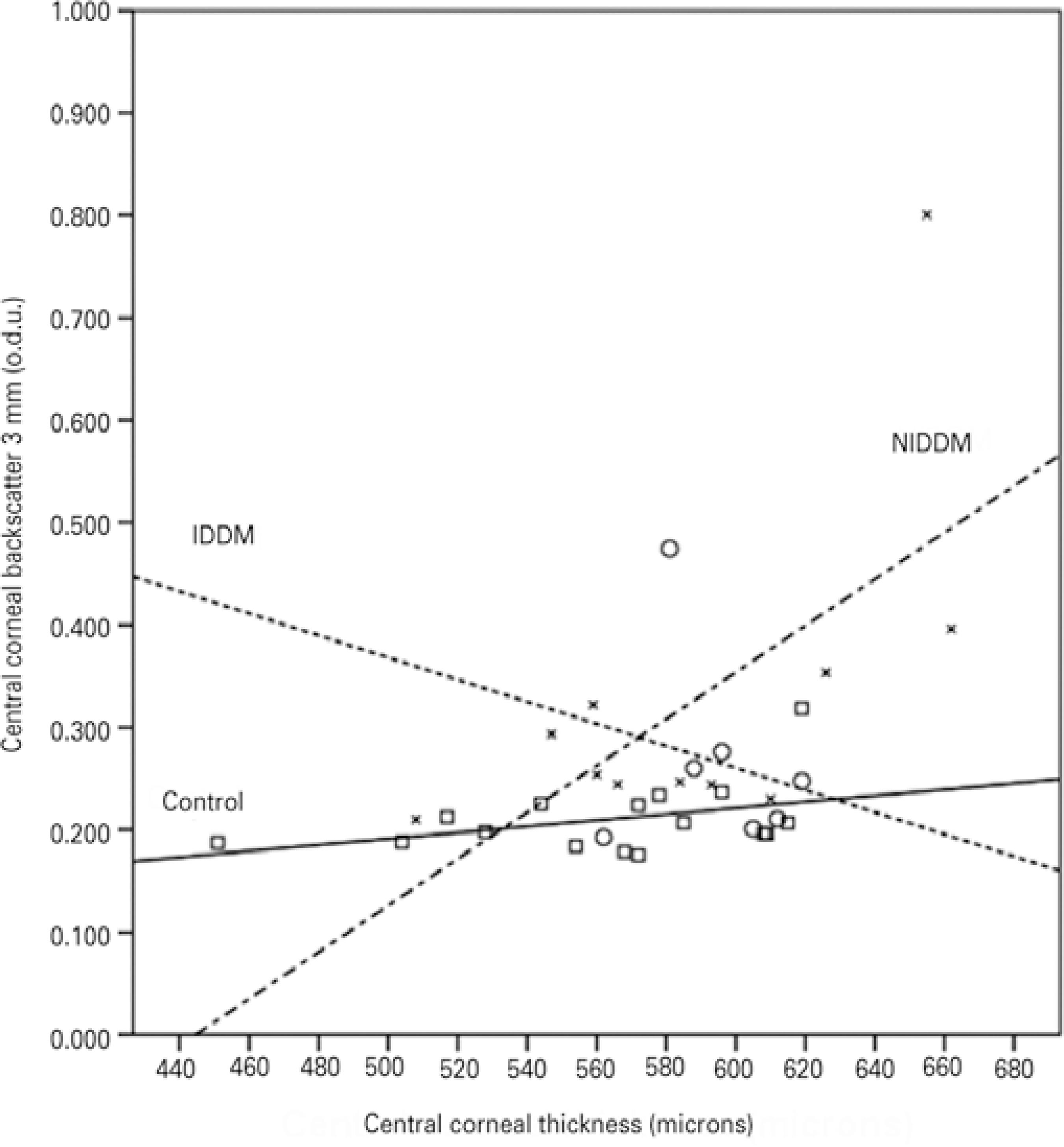 Figure 5 Correlations between corneal backscatter for the central 3 mm and central corneal thickness in the control subjects (squares and solid line; r=0.400; p>0.05), the patients with insulin-dependent diabetes mellitus (IDDM) (circles and dotted line; r=-0.071; p>0.05), and the patients with non-insulin-dependent diabetes mellitus (NIDDM) (blades and dotted/dashed line; r=0.641; p<0.05).