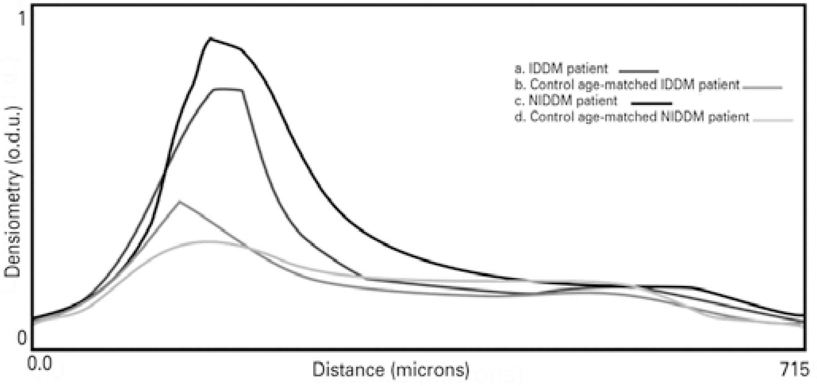 Figure 6 shows the optical density profiles of IDDM and NIDDM patients and their age-matched controls. All participants had a higher peak of optical density that decreased axially across the corneal thickness. This peak was particularly high for the NIDDM and IDDM patients.