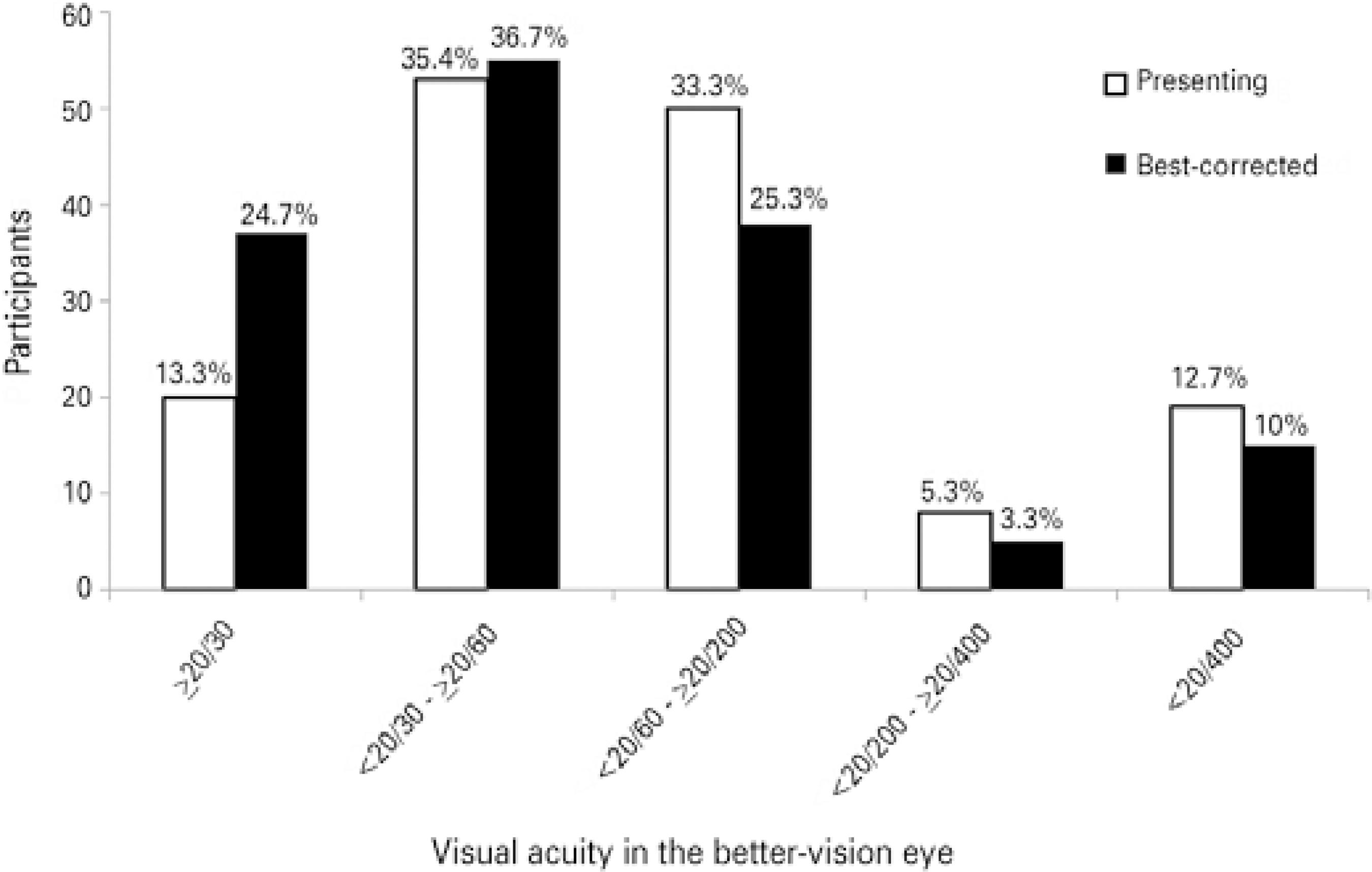 Graphic 1 The distribution of presenting and best-corrected visual acuity by the following distance visual acuity categories in best-seeing eyes: normal vision (≥20/30), mild visual impairment (<20/30 to≥ 20/60), moderate visual impairment (<20/60 to ≥20/200), severe visual impairment (<20/200 to ≥20/400), and blindness (<20/400)(15,17).