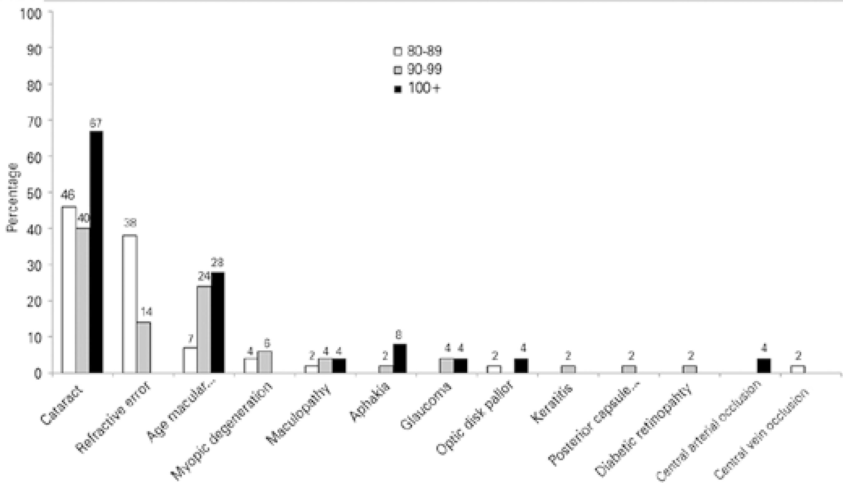 In the very old, we showed that AMD was very frequent, affecting 100% of all centenarians. Cataracts were also highly prevalent, with more than a third of the sample having previously undergone cataract surgery. Adequate spectacle correction is always desirable in this population, even when a small improvement in visual acuity is achieved, because small changes in image quality might significantly affect daily activities. The negative impact of visual impairment and blindness was confirmed by decreased scores in health- and vision-re lated quality of life instruments. We conclude that the shift in developing countries' populations toward older ages justifies high quality eye care to ensure best vision and quality of life.