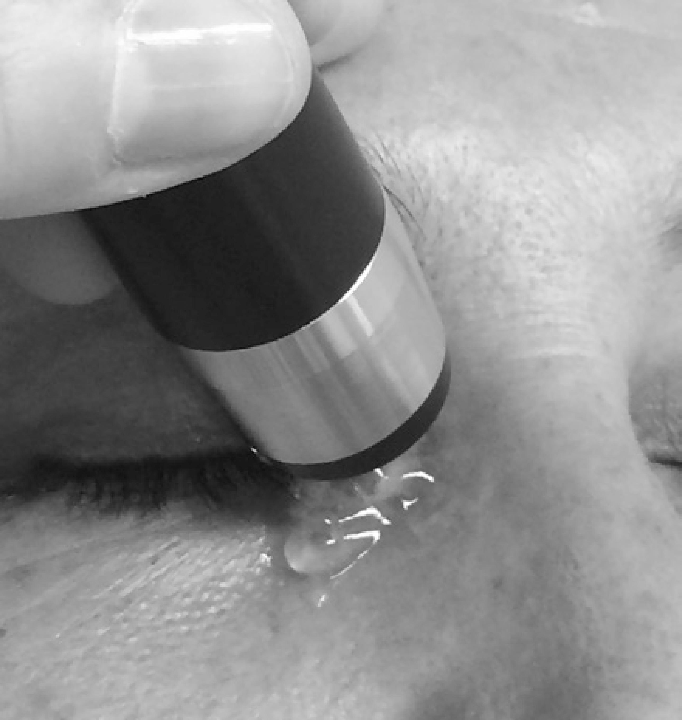 All individuals were evaluated in the supine position 5 min after instillation of one drop of proxymetacaine hydrochloride 0.5% (Anestalcon®; Alcon, Hünenberg, Switzerland) in the conjunctival fornix of the eye to be examined.