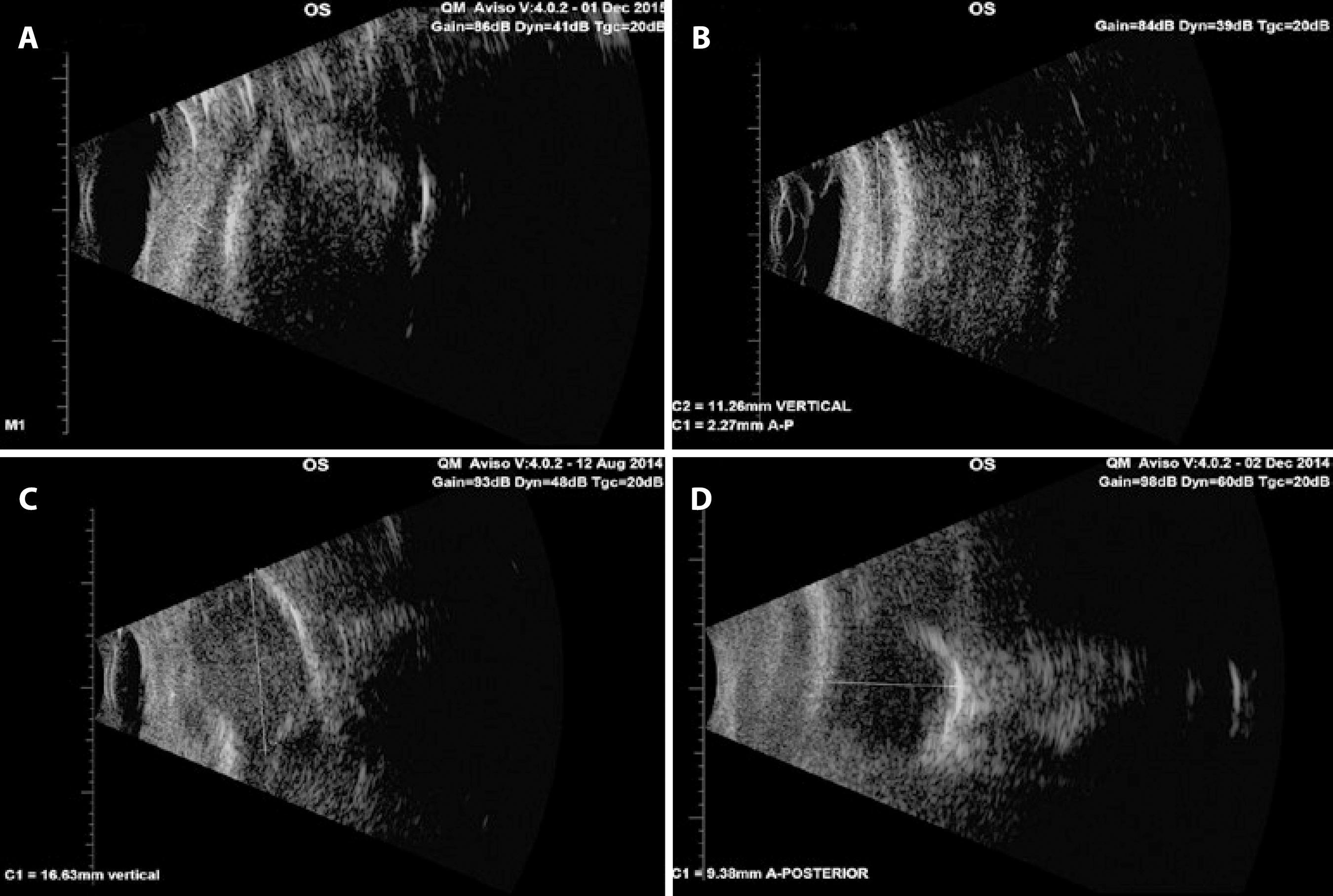 Figure 2 A and B) Normal lacrimal sac. A) Oval shape, hypoechogenic content. B) Oval shape, vertical diameter=11.26 mm, hypoechogenic content. C and D) Chronic dacryocystitis. Note the different shapes, sizes, and contents that an affected lacrimal sac can have. C) Oval shape, vertical diameter=16.63 mm, dense punctate content. D) Circular shape, anteroposterior diameter=9.38 mm, homogeneous, hypoechogenic punctate content.