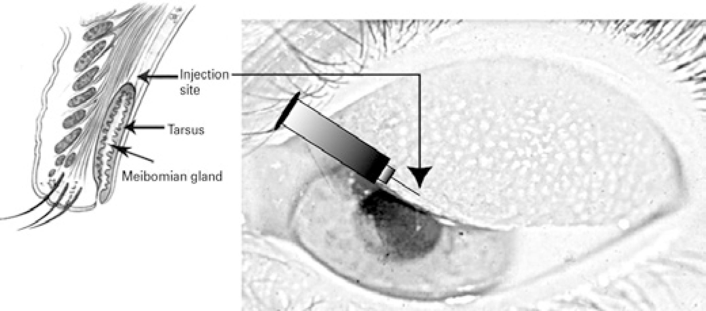 Figure 1 Injection site approximately 0.5-1 mm above the superior tarsal border in potential space between conjunctiva and Muller's muscle.
