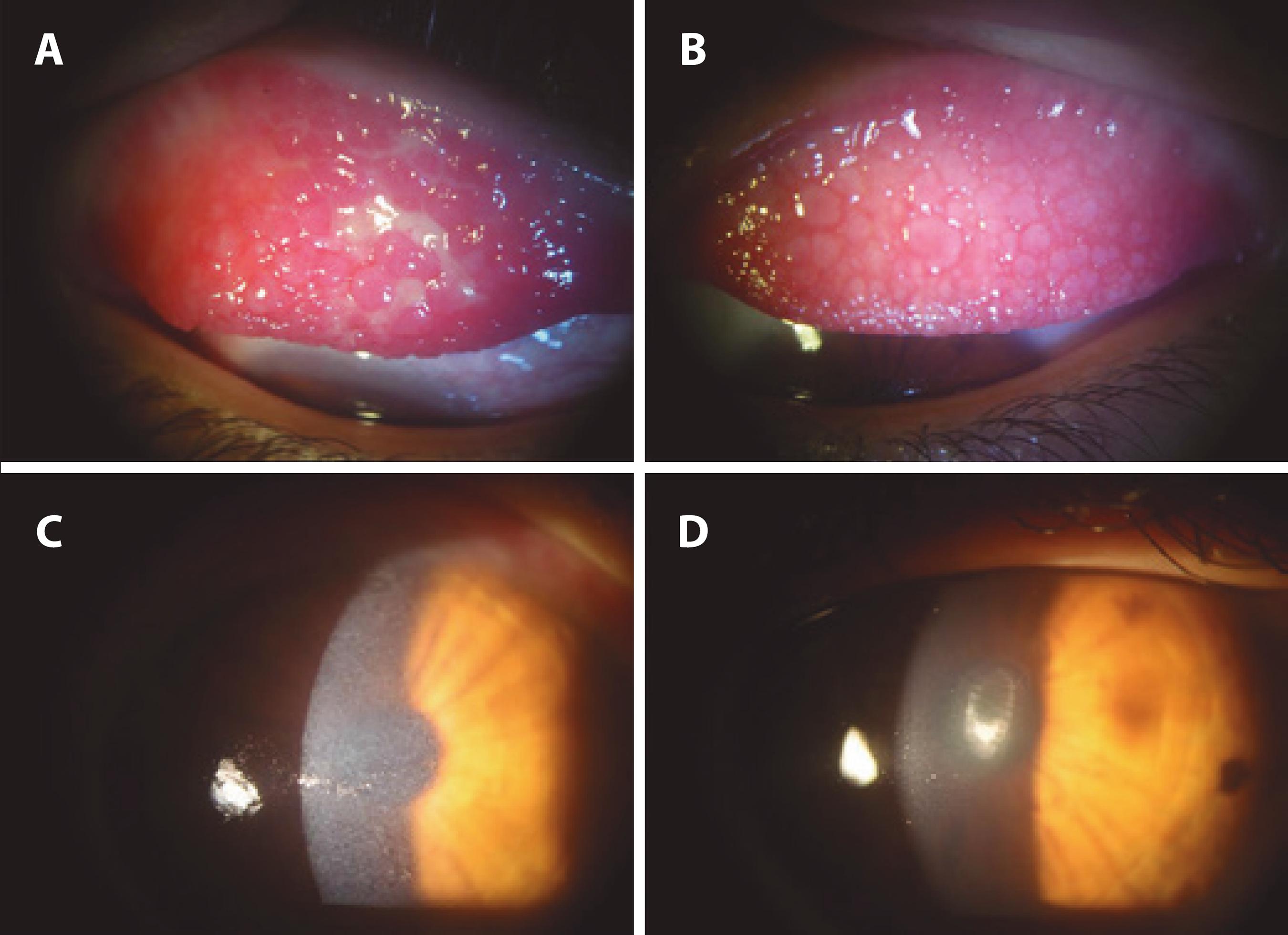 Figure 2 Efficacy of supratarsal triamcinolone injection after 1 week on the upper tarsal conjunctiva and cornea. A) Inflammation of the upper tarsal conjunctiva showing the Maxwell Lyon's sign and inflamed giant papillae. B) Improvement of conjunctival congestion, flattened giant papillae, mucous discharge, and edema after treatment. C) Diffuse keratitis was noted before treatment. D) Clear cornea with no keratitis after treatment.