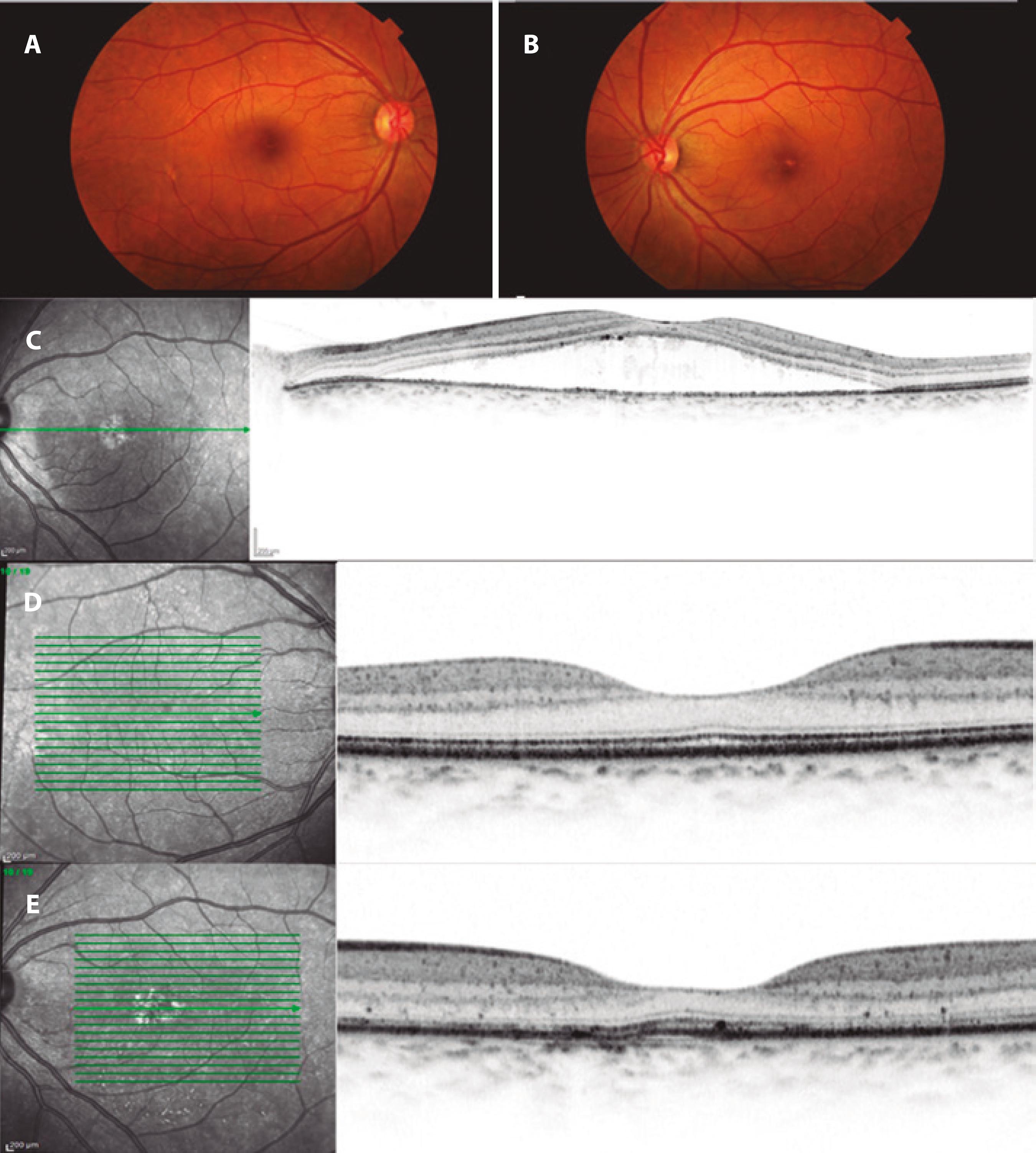 Figure 1 Retinography in OD (A) and OS (B). Yellowish lesions can be seen in the foveal topography of OS. The OCT of OS for the new case (C) shows separation of the photoreceptor layer of the RPE by foveal topography. A recent OCT of OD (D) is normal and in OS (E) there are marks of focal laser in the inferior macular area (infrared) and irregularities of the outer limiting membrane and Bruch/RPE complex in the selected section. OCT= optical coherence tomography; OD= oculus dexter; OS= oculus sinister; RPE= retinal pigment epithelium.