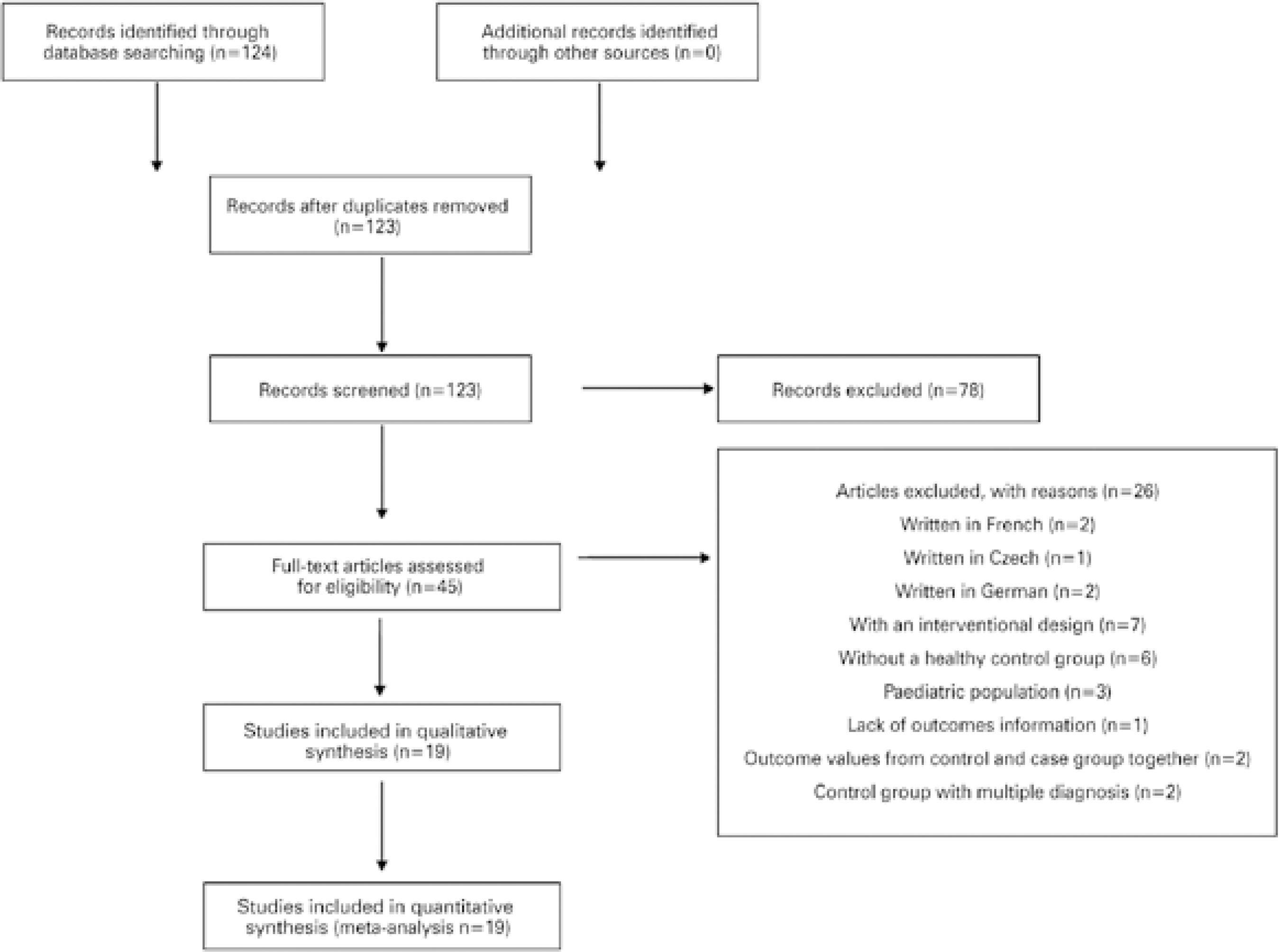 From a total of 124 studies screened, only 19 complied with our eligibility criteria, as shown in figure 1. Table 1 and figures 2 and 3 summarize the mean and standard deviation (SDs) of both CH and CCT for the control and case groups of each study(11-29).