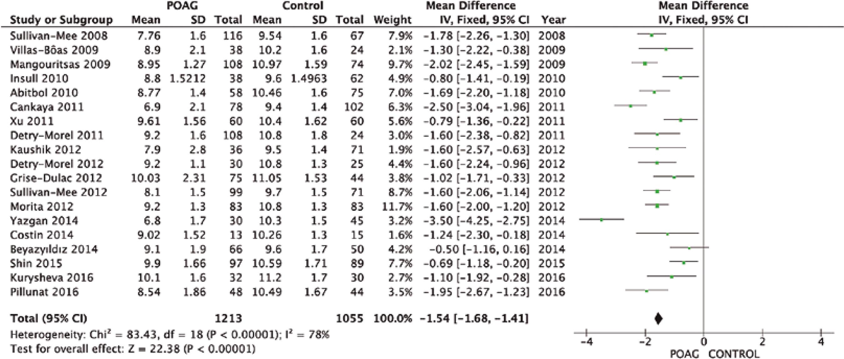 | Sullivan-Mee, 2008(27) | Glaucoma | 99 | 99 | 8.10 ± 1.50 | 541.00 ± 41.00 |