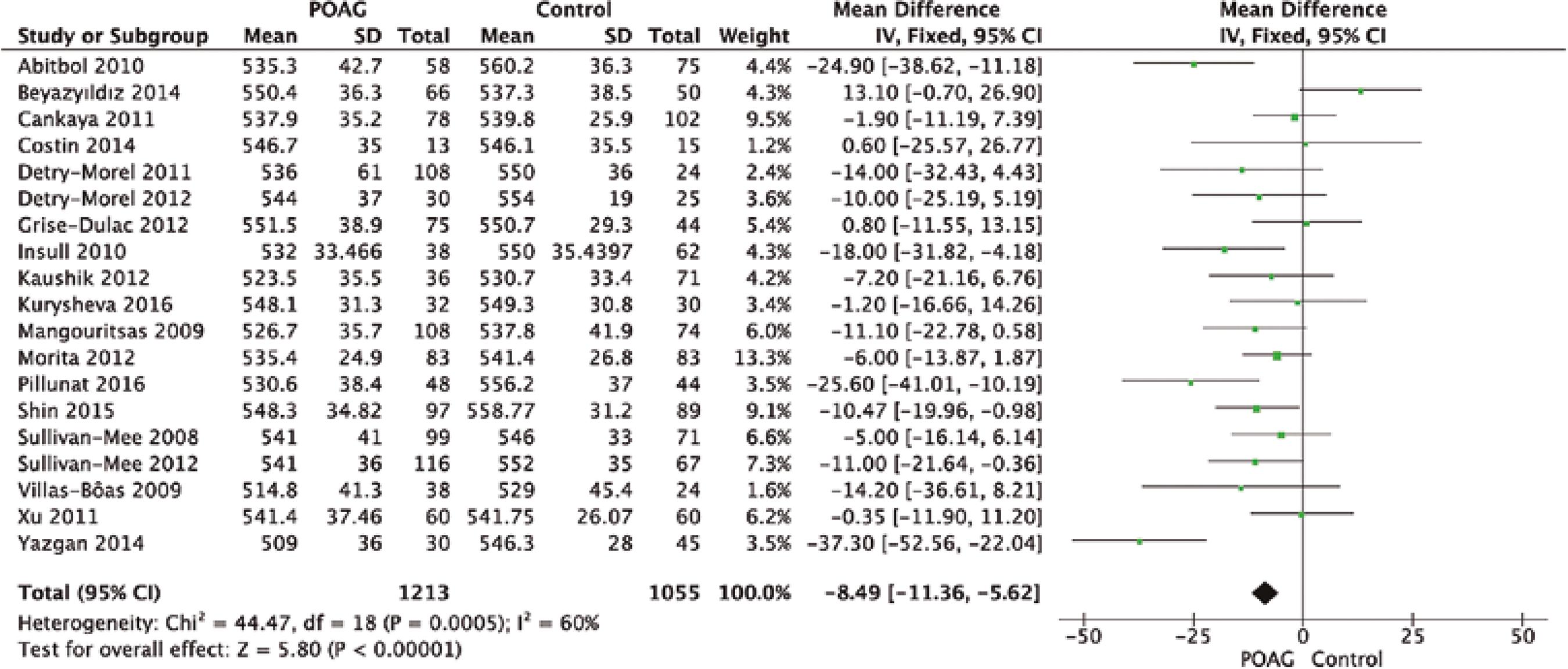 | Cankaya, 2011(21) | Glaucoma | 78 | 78 | 6.90 ± 2.10 | 537.90 ± 35.20 |