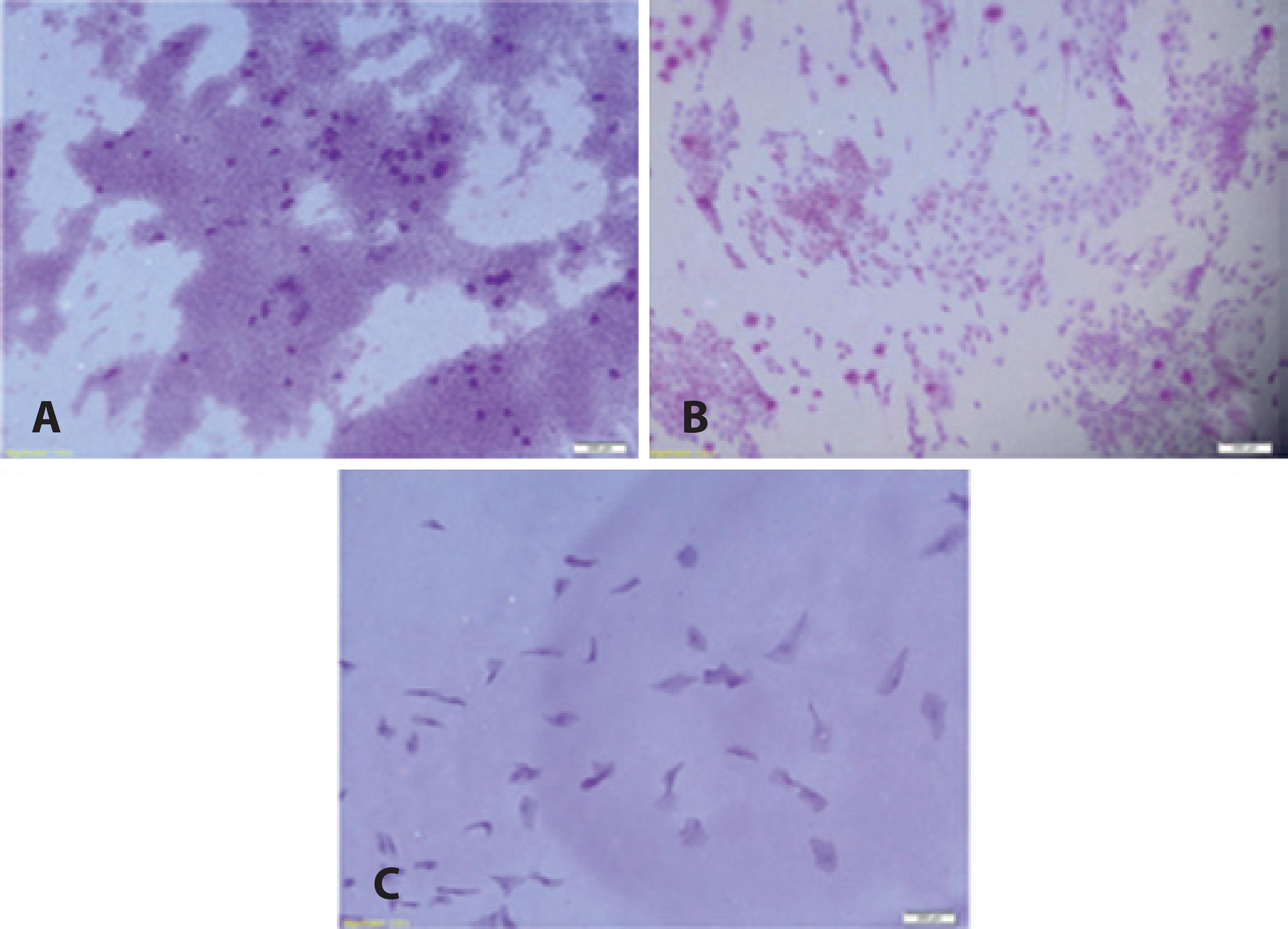Immediately following on the previous test, and after applying topical anesthetic, a small piece of Millipore filter paper measuring approximately 5 × 7 mm was used, with a different shape for each of the areas evaluated, a square end for the upper region and a tapered end for the temporal region. The paper was pressed against the bulbar conjunctiva in the upper and lateral quadrants of the right eye for 2-5 sec using blunt smooth-ended forceps. The filter paper was then removed and placed in a screw-topped test tubes marked with the patient's identifying number and containing a small quantity of fixative sufficient to cover the filter paper. The fixative was prepared in advance by combining 100 cc 70% ethanol, 5 cc of glacial acetic acid, and 5 cc of 37% formaldehyde. For staining, the paper was removed with tweezers and placed in a well of a tissue culture plate. Staining was analyzed by a blinded investigator11. The preparations were assessed for cellularity, cell adhesion, the presence of goblet cells, nucleus-to-cytoplasm ratio, and cell keratinization. Samples (Figures 2 A-2 C) were graded as type 1-normal (0-3), type B-moderate (4-6), or type C-abnormal (>6).
