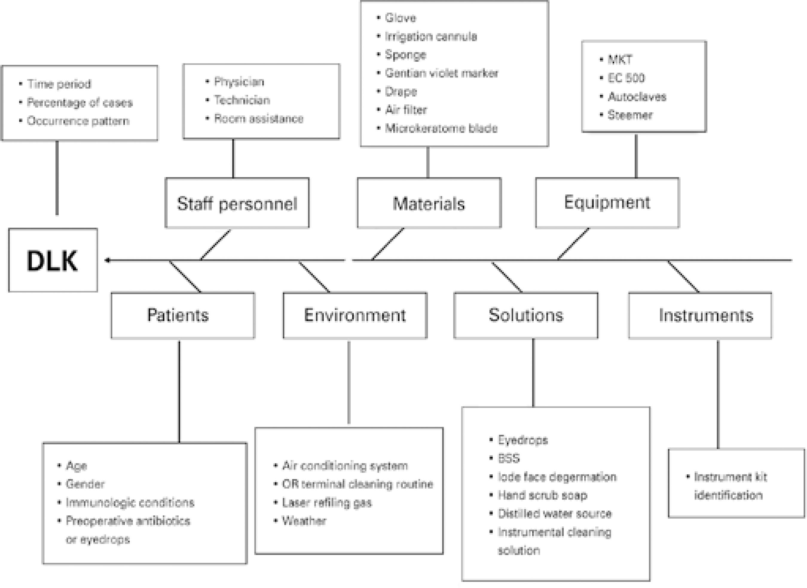 Figure 1 An Ishikawa diagram in which the focus of the analysis was a diffuse lamellar keratitis (DLK) outbreak. All probable causes of the problem are listed according to the major categories that form the spine bones of the “fish