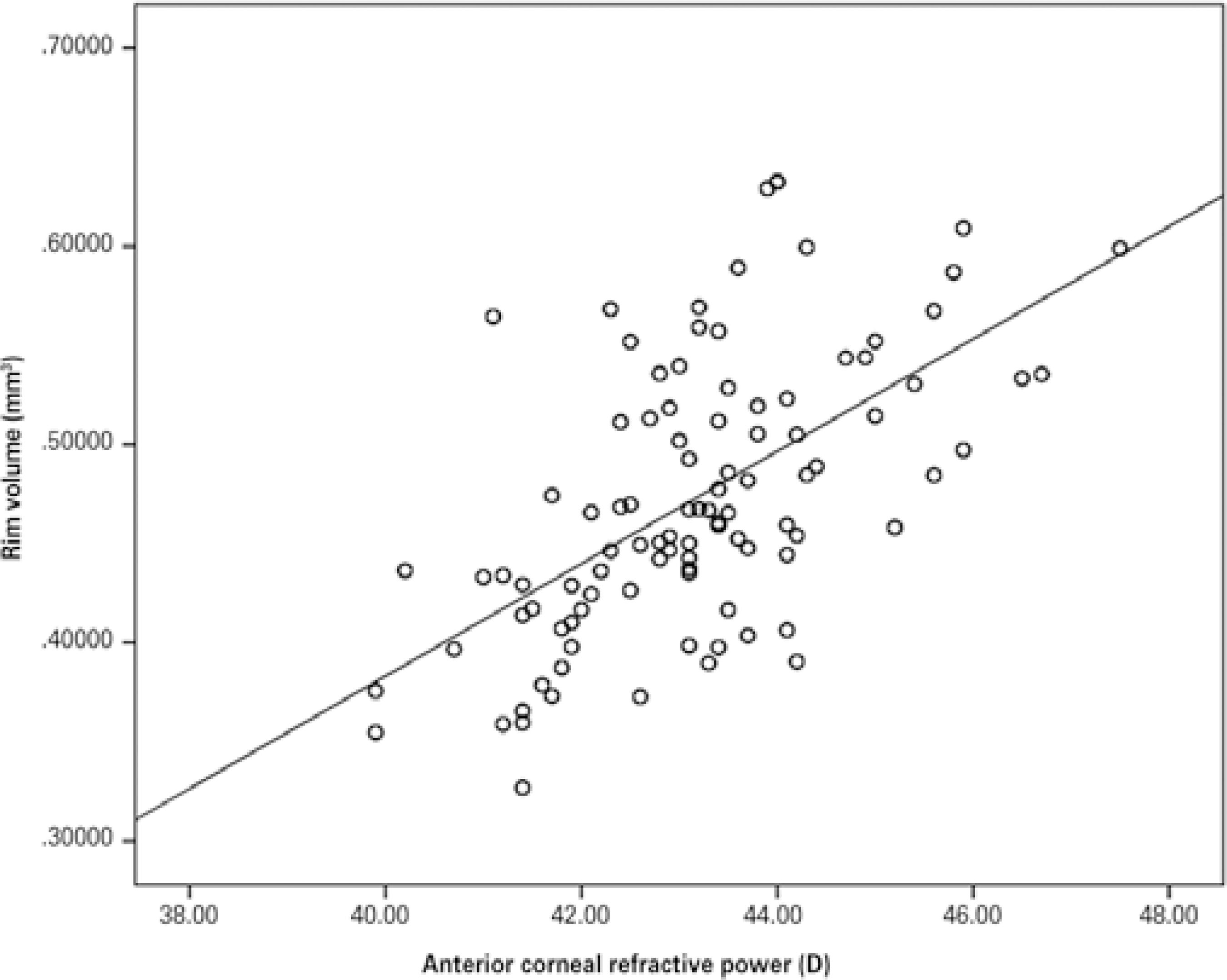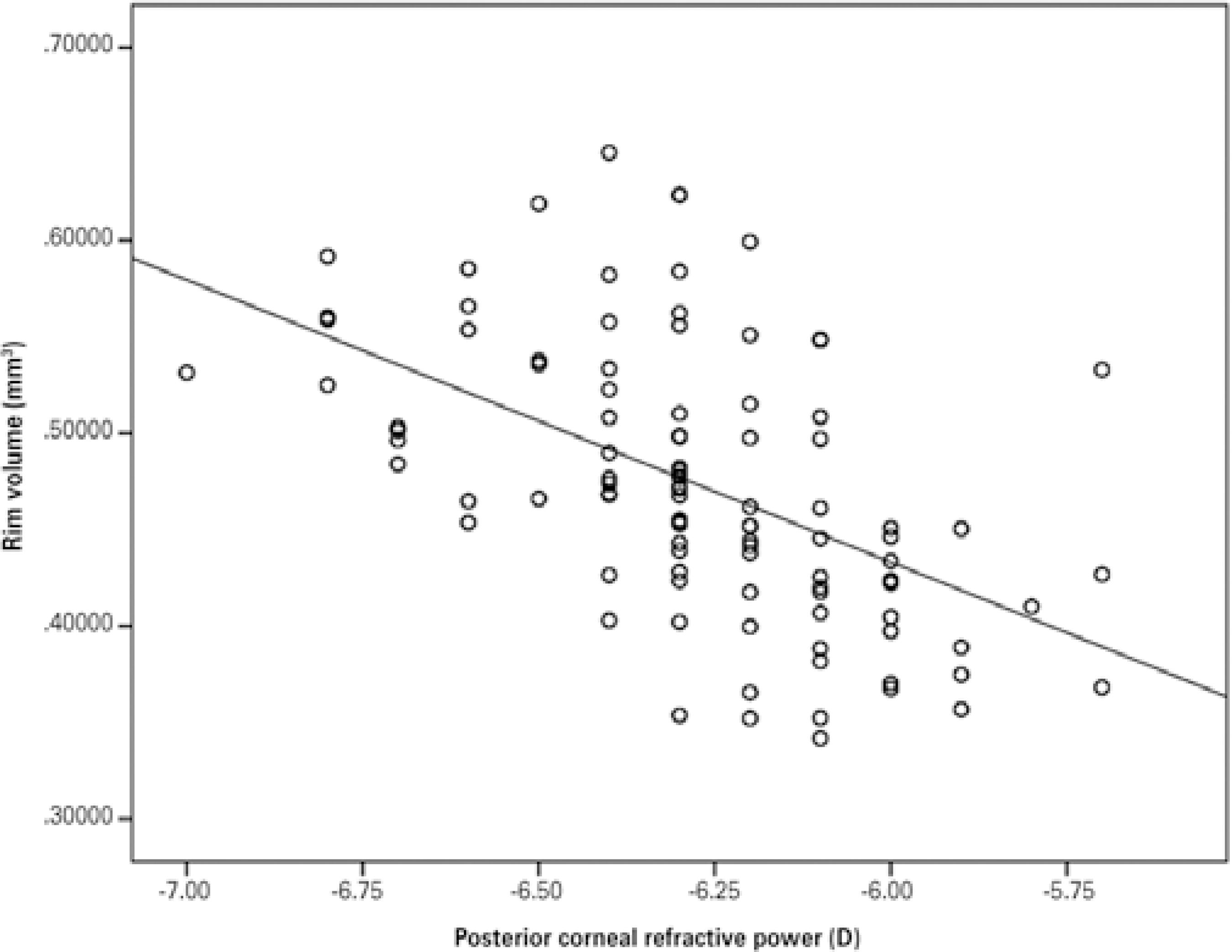 Significant correlations between anterior or posterior corneal refractive power and CA, RA, RV, C/D area, and linear C/D were also apparent after multiple regression analysis. For example, a 1-D increase in anterior corneal refractive power corresponds to a 0.034-mm3 increase in RV. Correlations between anterior and posterior corneal refractive power and RV were shown on the basis of the scatterplot distribution (Figures 1 and 2).
