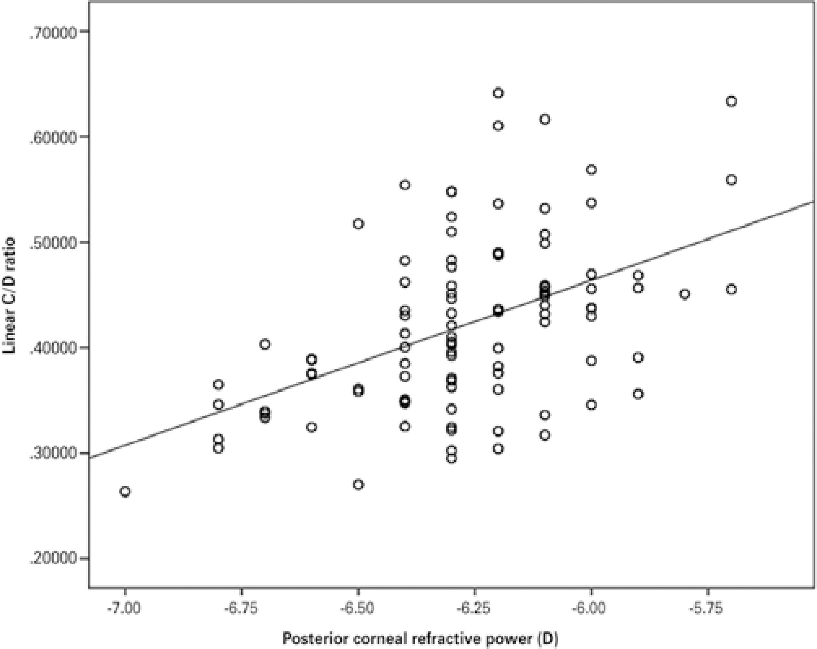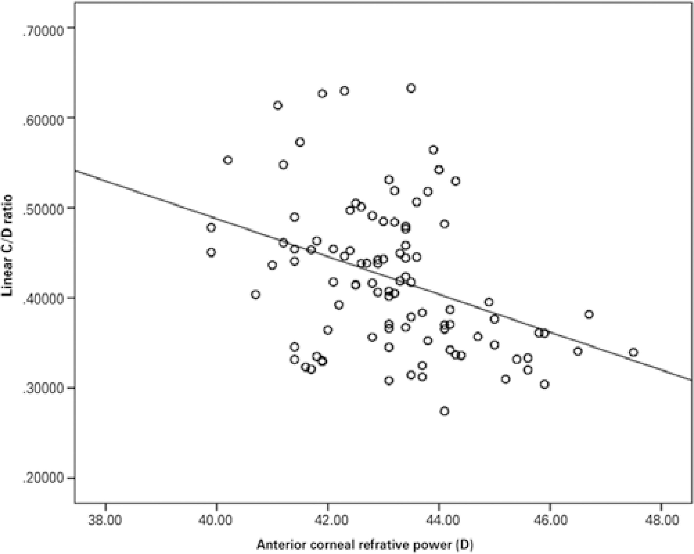 CV and CD measurements showed significant relationships with none of the corneal parameters. As seen in table 3, none of the anterior segment parameters except refractive power of the cornea (both anterior and posterior) correlated with C/D (C/D area and linear C/D). In multivariate regression models, a 1-D increase in anterior corneal refractive power was associated with a 0.022 decrease in linear C/D (Figure 3). Posterior corneal refractive power was also strongly correlated with linear C/D (Figure 4).