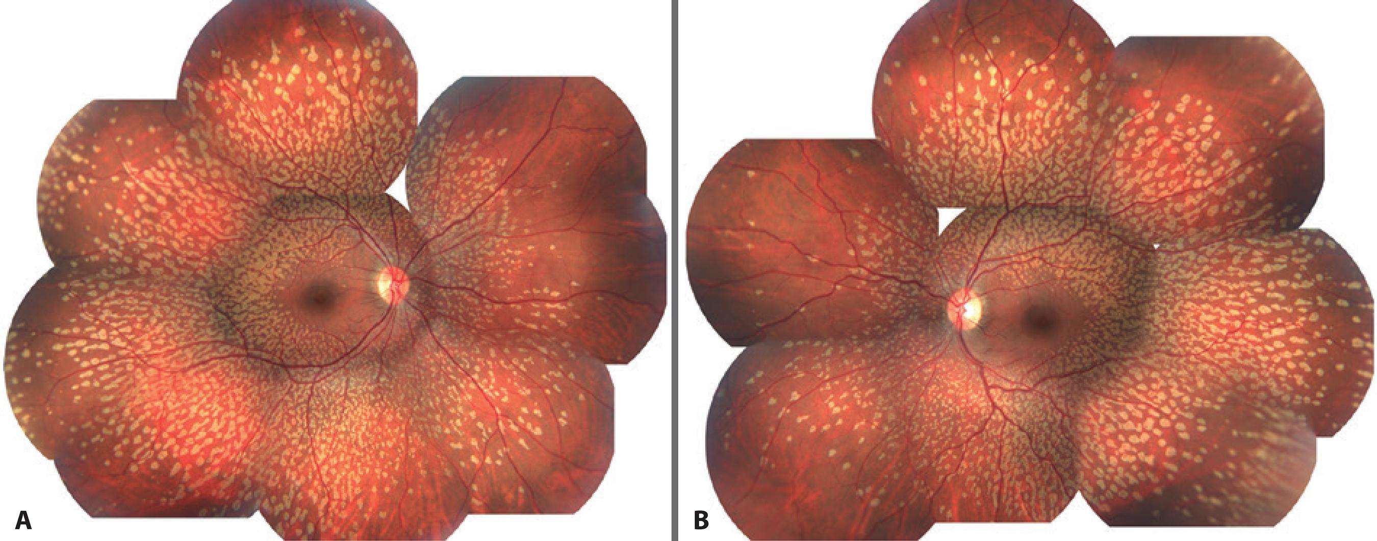 Figure 1 A and B) Fundus photographs showing numerous yellowish flecks that affected the post-equatorial retina but spared the macula.