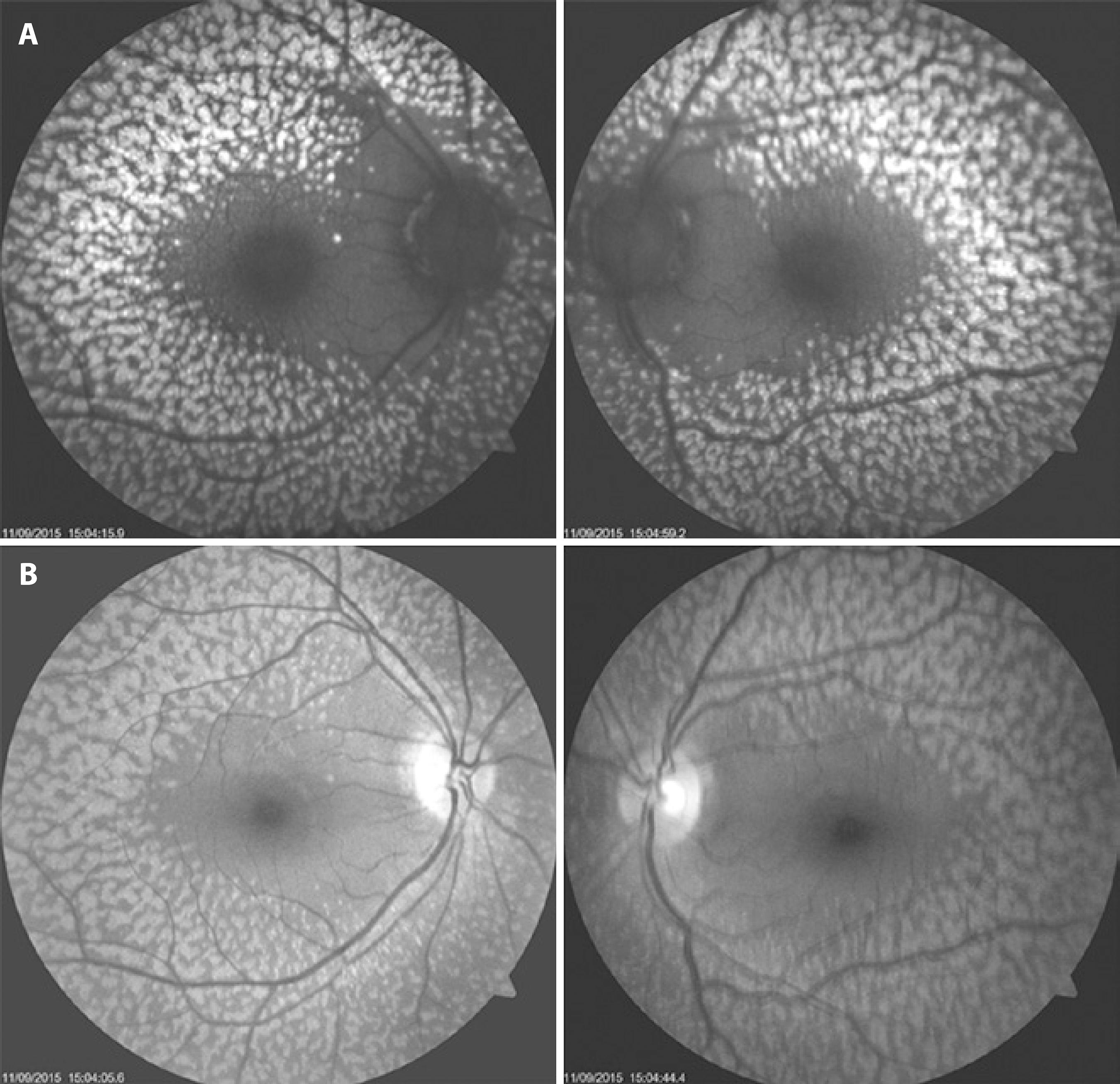 Figure 2 A) Fundus autofluorescence demonstrating a symmetrical pattern of yellow-white fleck lesions that affected both fundi. B) Infrared imaging showing the same configuration.