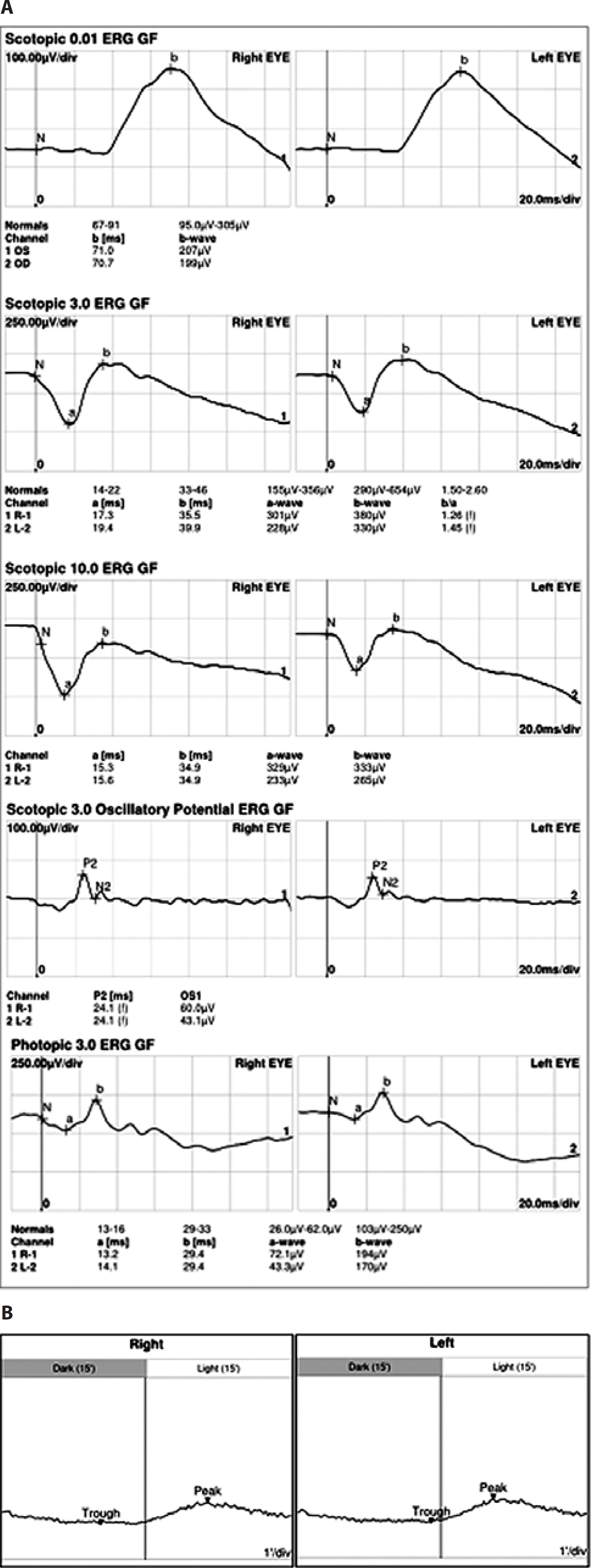 Figure 3 A) Standard full-field electroretinogram elicited by various stimulus intensities in scotopic and photopic conditions with no abnormalities. B) Electrooculogram recordings. The light peak/dark trough ratio (Arden ratio) was 1.9 in the right eye and 2.0 in the left eye.
