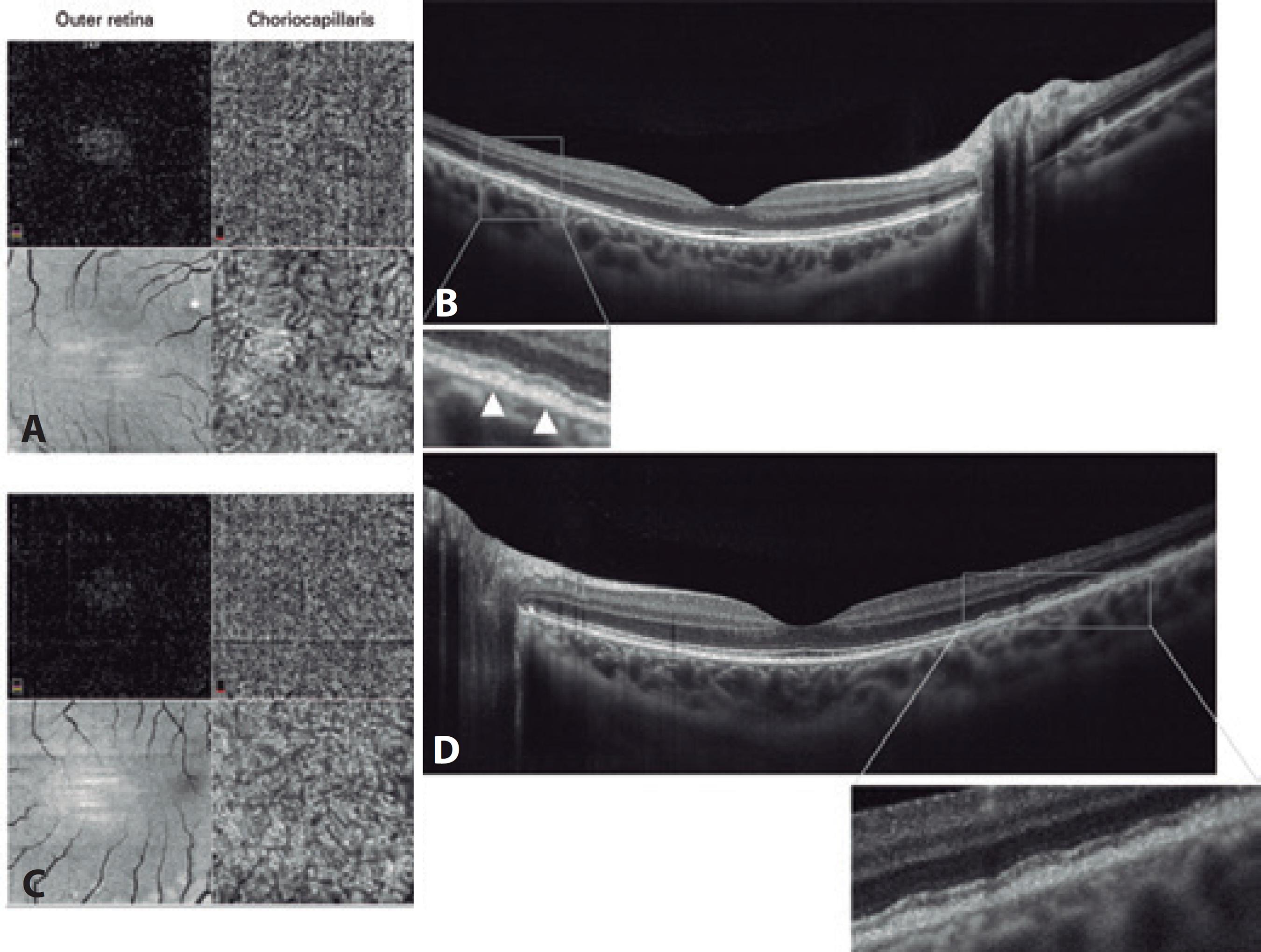Figure 4 Optical coherence tomography (OCT) angiography with a split-spectrum amplitude decorrelation algorithm and structural en face OCT 3 × 3 mm (A and C), which showed no macular injury from the outer retina to the level of choroid capillary in both eyes. The OCT B-scan (B and D) demonstrated a slight increase in the thickness of the retinal pigment epithelium, leading to multiple small pigmented epithelium detachments. The enlarged images of the boxed regions show the outer retina and retinal pigment epithelium of both eyes in detail. The hyperreflective band corresponding to the photoreceptor inner/outer segment junction remained intact in both eyes.