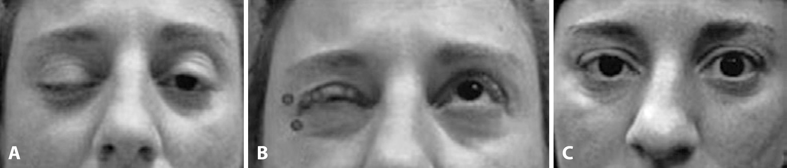 On examination, best corrected visual acuity was 20/20 in both eyes. The palpebral fissure opening was 1 mm for the right eye (OD) and 9 mm for the left eye (OS). Full extraocular motility and pupils were normal. The margin reflex distance OD was -4 mm and 3 mm OS, and levator function was 12 OD and 15 mm OS. The right orbicularis muscle maintained contraction in the right upper and lower eyelid, and voluntary opening of the OD was impaired throughout the day. The closure function of the orbicularis was normal. The patient stated that the condition disrupted activities of daily living, such as driving, going out alone, and reading on the computer, all of which decreased her quality of life (Figure 1 A).