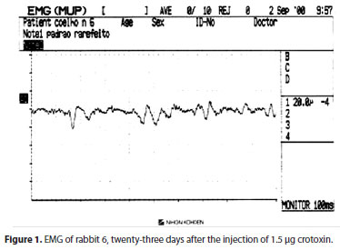 Electromyographic findings demonstrated that crotoxin caused a reversible paralysis of muscular activity, being proportional to the dose injected, according to other authors(13). Reduction in action potentials was observed mainly in crotoxin concentrations greater than 1.5 µg. Recovery of paralysis was gradual, and at the end of two months of follow-up, electromyographic records were almost normal. BT-A injected also caused a reversible paralysis. Action potentials of muscles injected with BT-A had its recovery starting after nine days, and were close to normality after two months. That shows that paralysis induced by known concentrations of crotoxin had similar duration than BT-A.