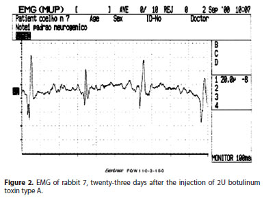Electromyographic (EMG) exams in superior recti muscles of all animals were normal before the injections, and they were repeated with 2, 9, 16, 23 and 58 days.