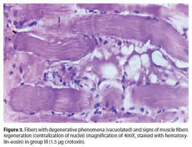 In group I (0.015 µg crotoxin), there was a discrete endomysial fibrosis on the injected area, the remaining muscle being normal. In group II (0.15 µg crotoxin), endomysial fibrosis slightly more evident than in group I. In group III (1.5 µg crotoxin), more evident local lesions as: discrete chronic inflammation, characterized by discrete lymphocytic mononuclear histiocytic infiltrate, myophagocytosis and edema with endomysial fibrosis, fibers with degenerative phenomena (vacuolated) and signs of muscle fibers regeneration (centralization of nuclei) (Figure 3).