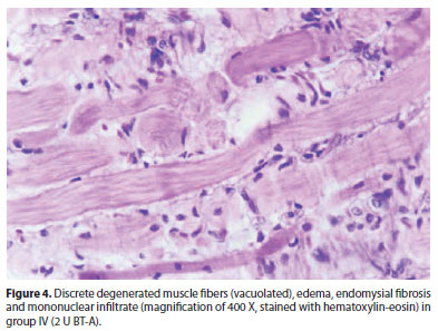 In group IV (2 U BT-A), anatomo-pathology alterations were similar to those found in group III (Figure 4).